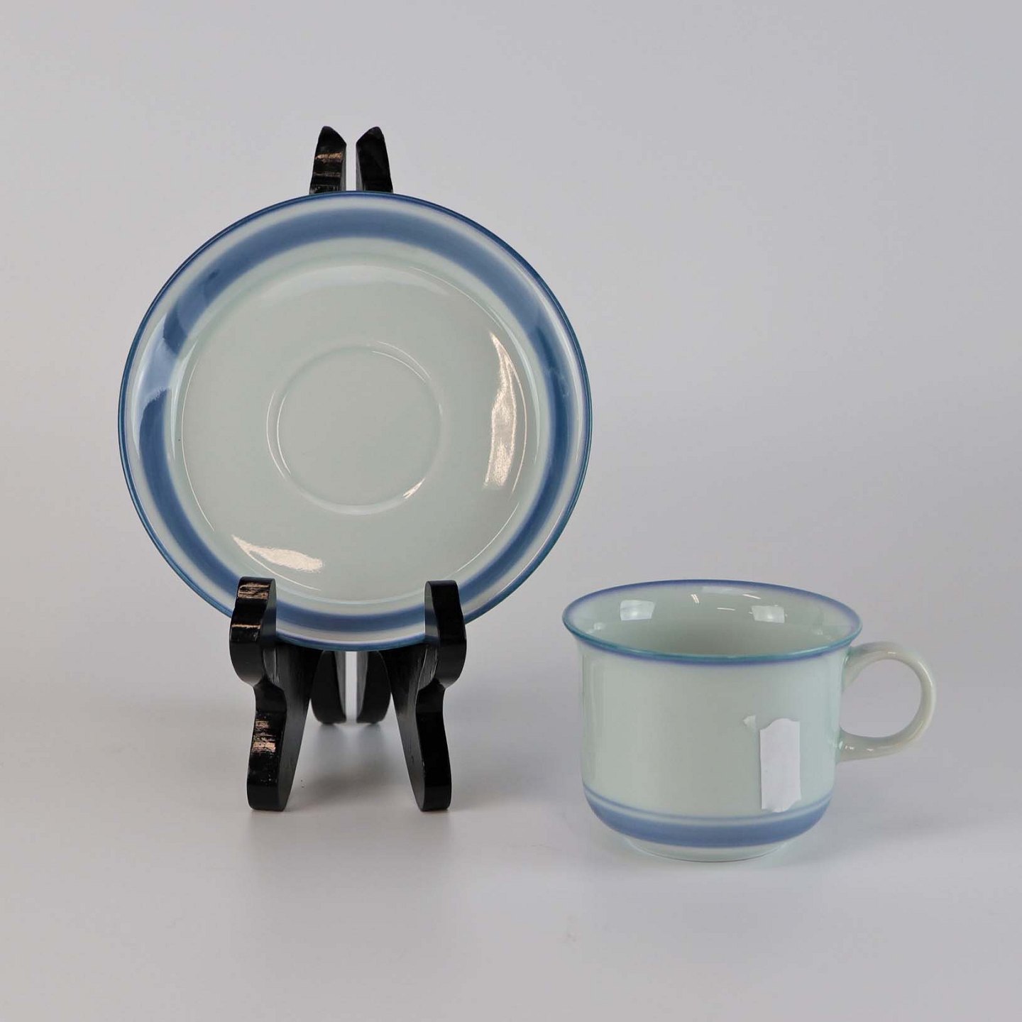 Stellets runde former er dækket med en silkeblød glasur og håndmalet med er lys almueblå farve lagt under glasuren. Stellet er ovnfast