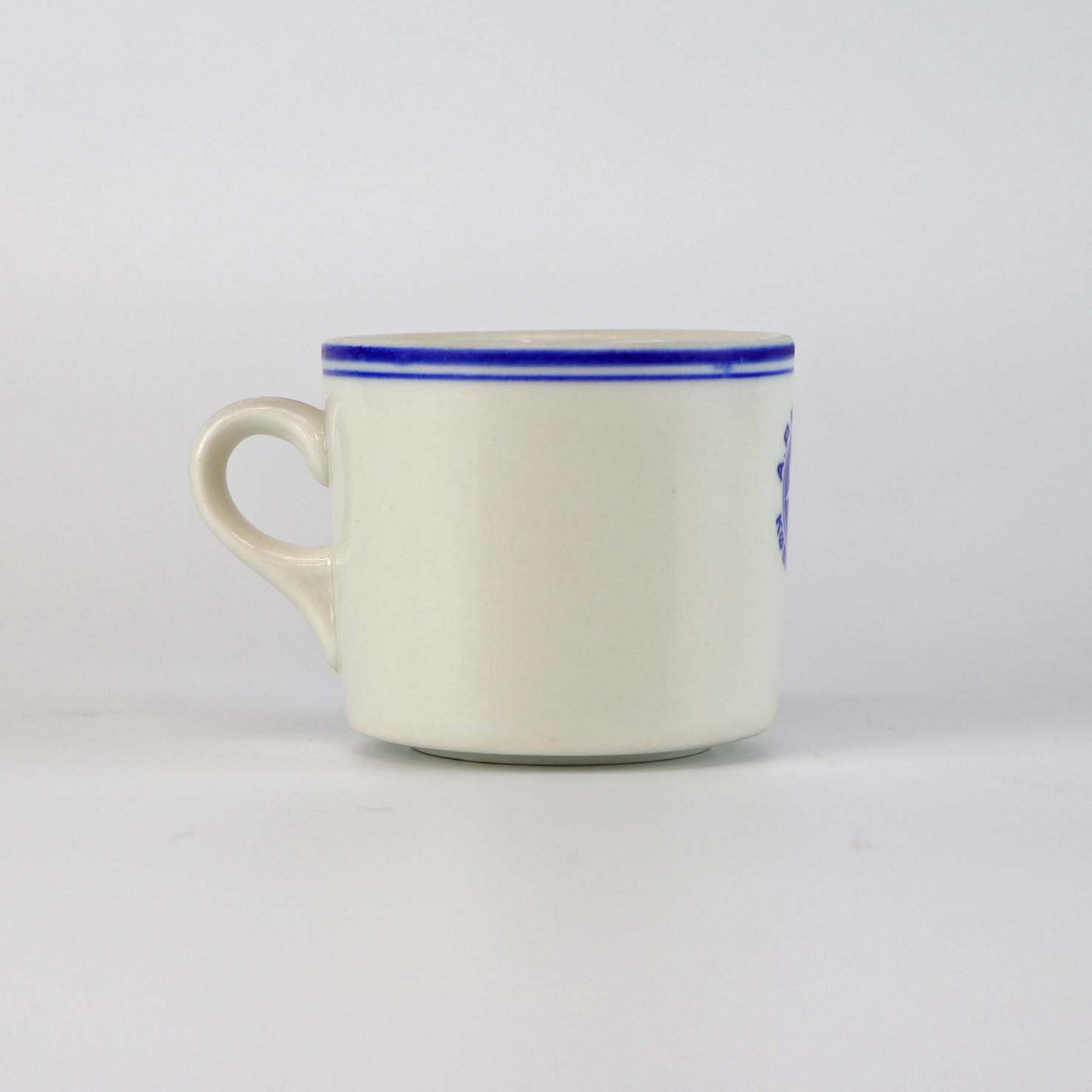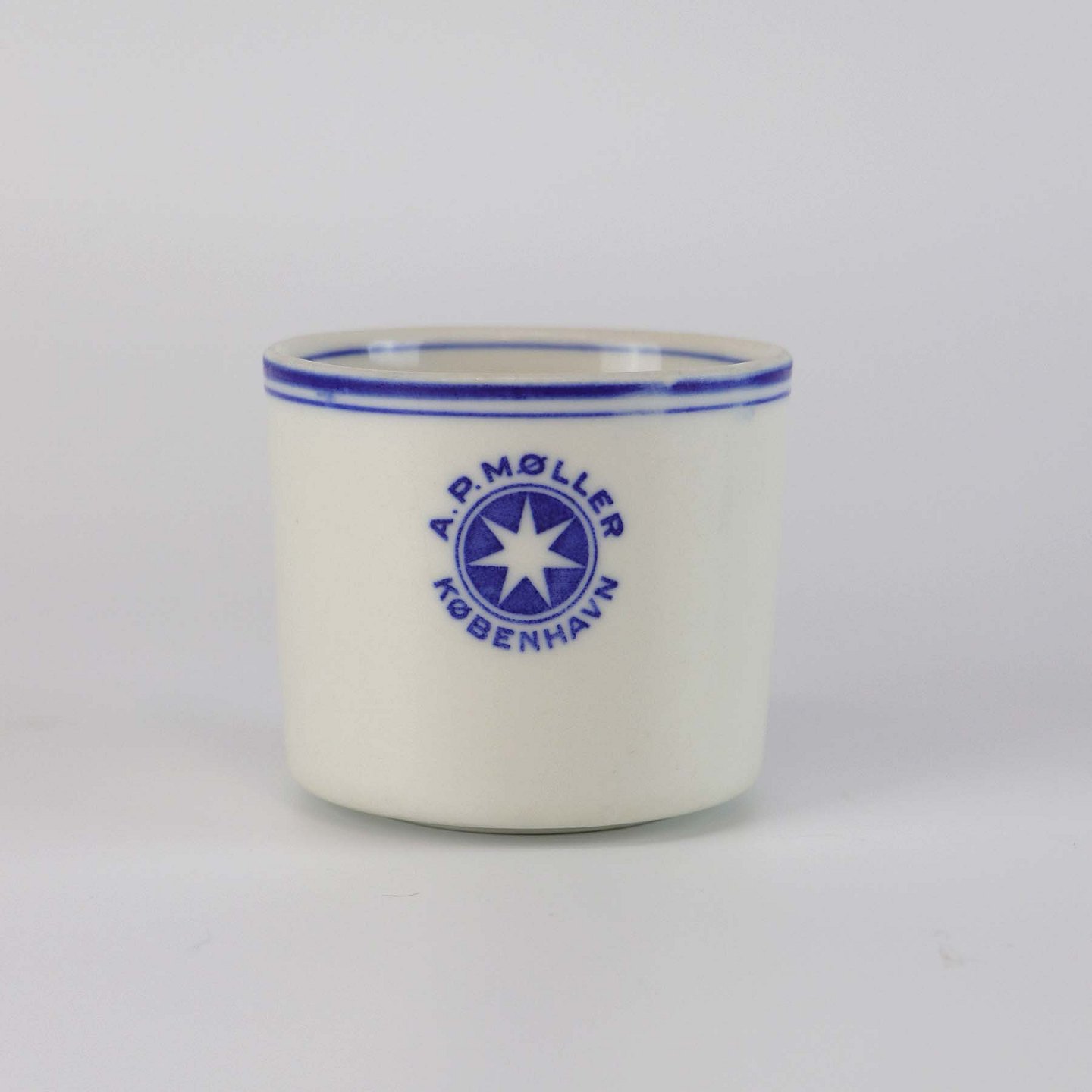 Krus af kraftigt porcelæn med teksten A.P. Møller København. No 102