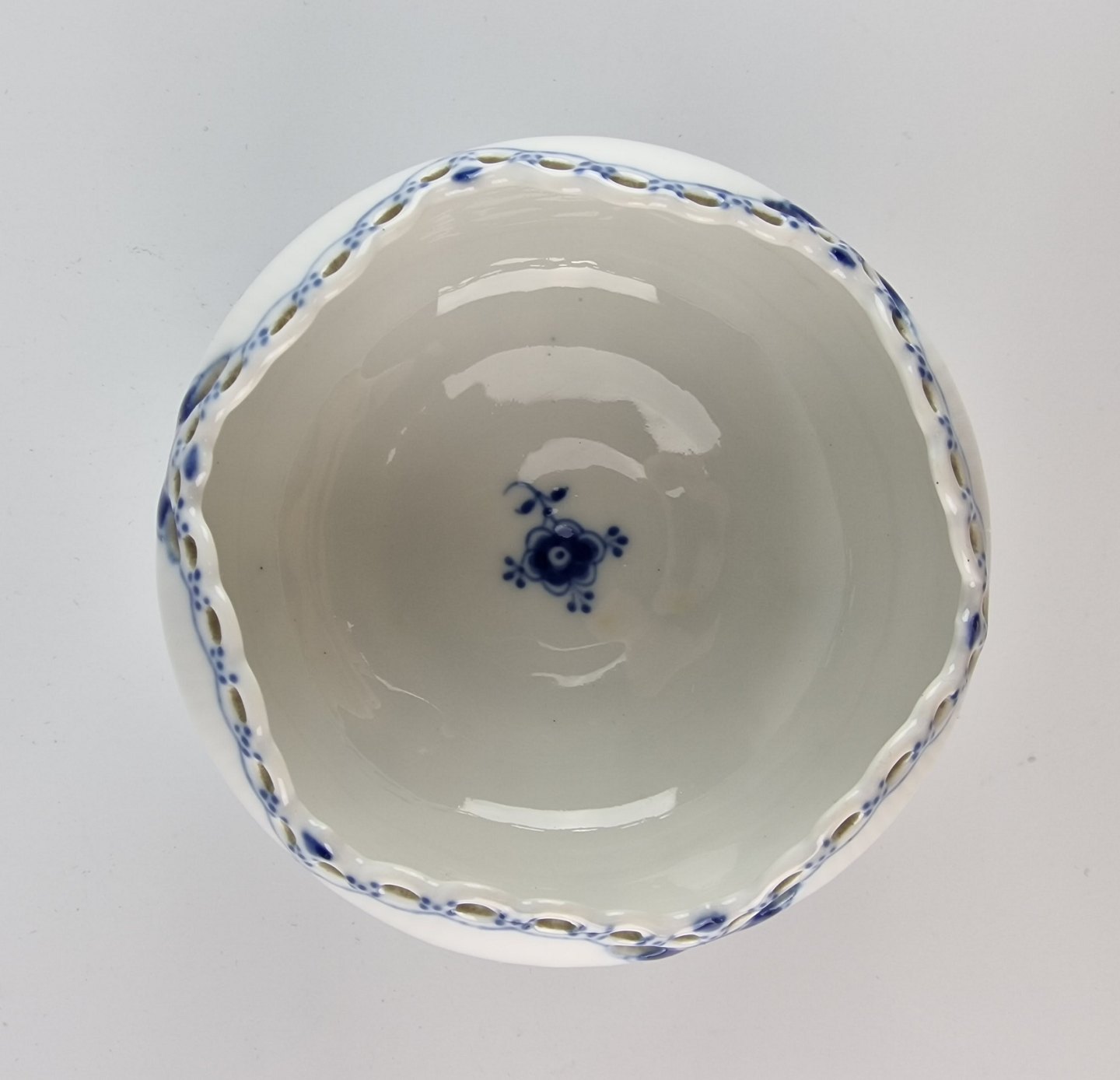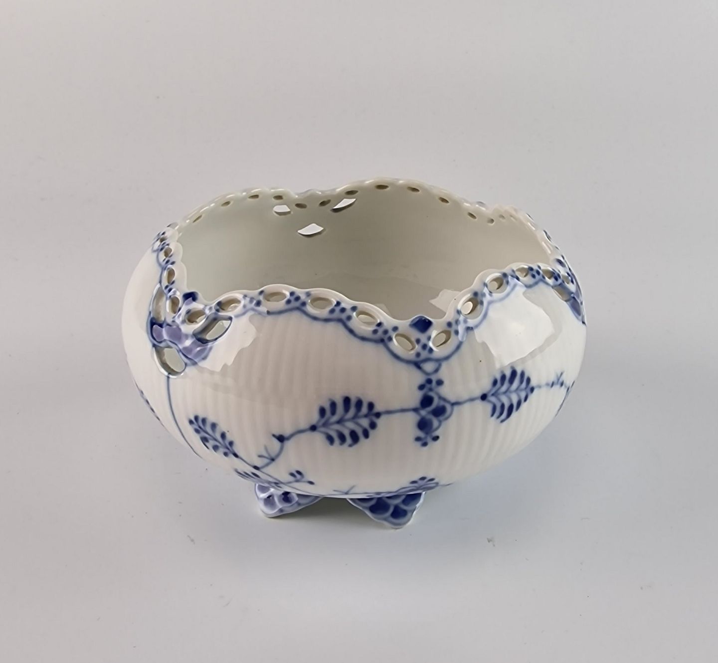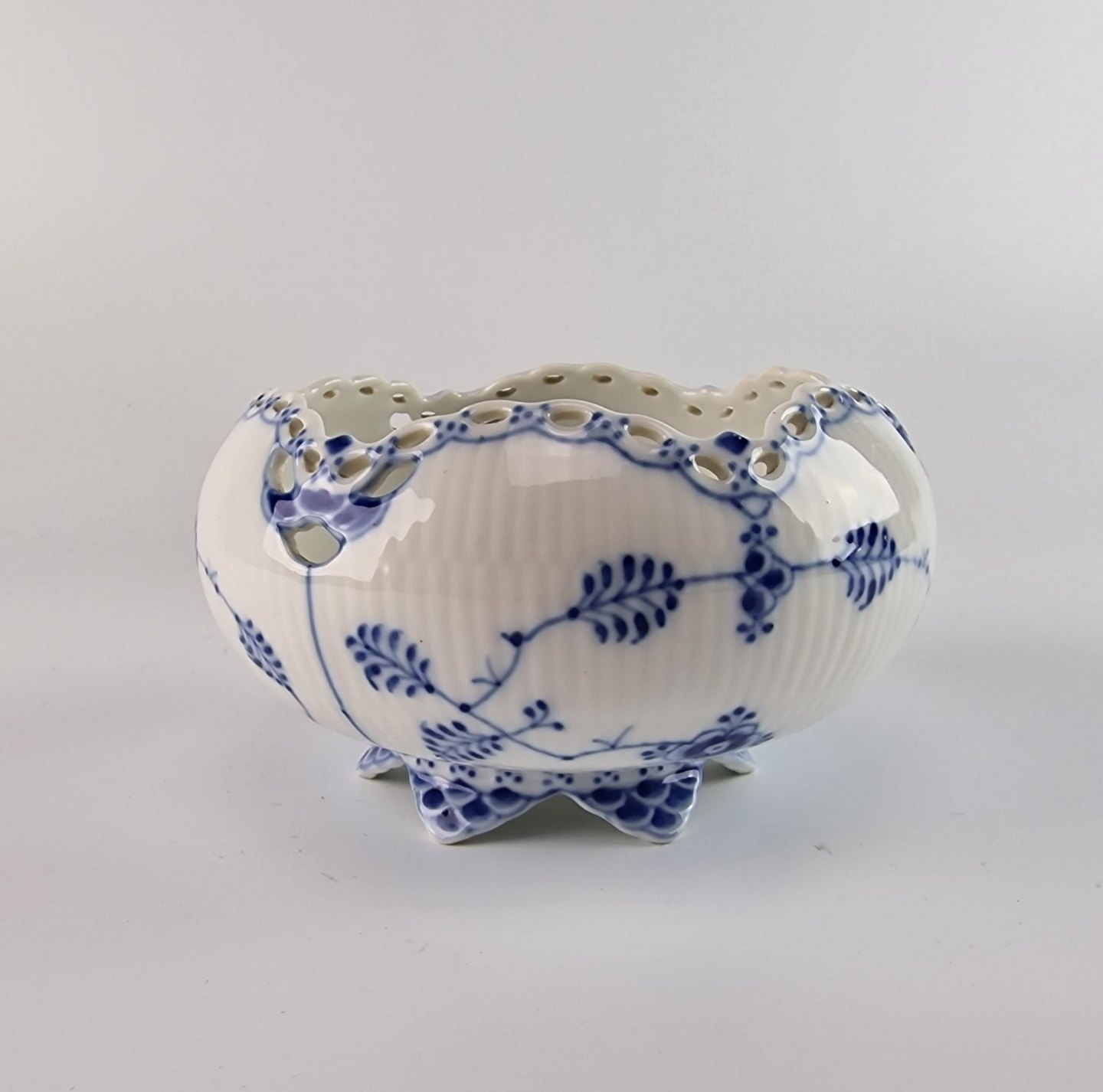 Stellet Musselmalet Helblonde er hvidt porcelæn dekoreret med blå blomster og mønstre. Øverst er porcelænet dekoreret med hulmønster.