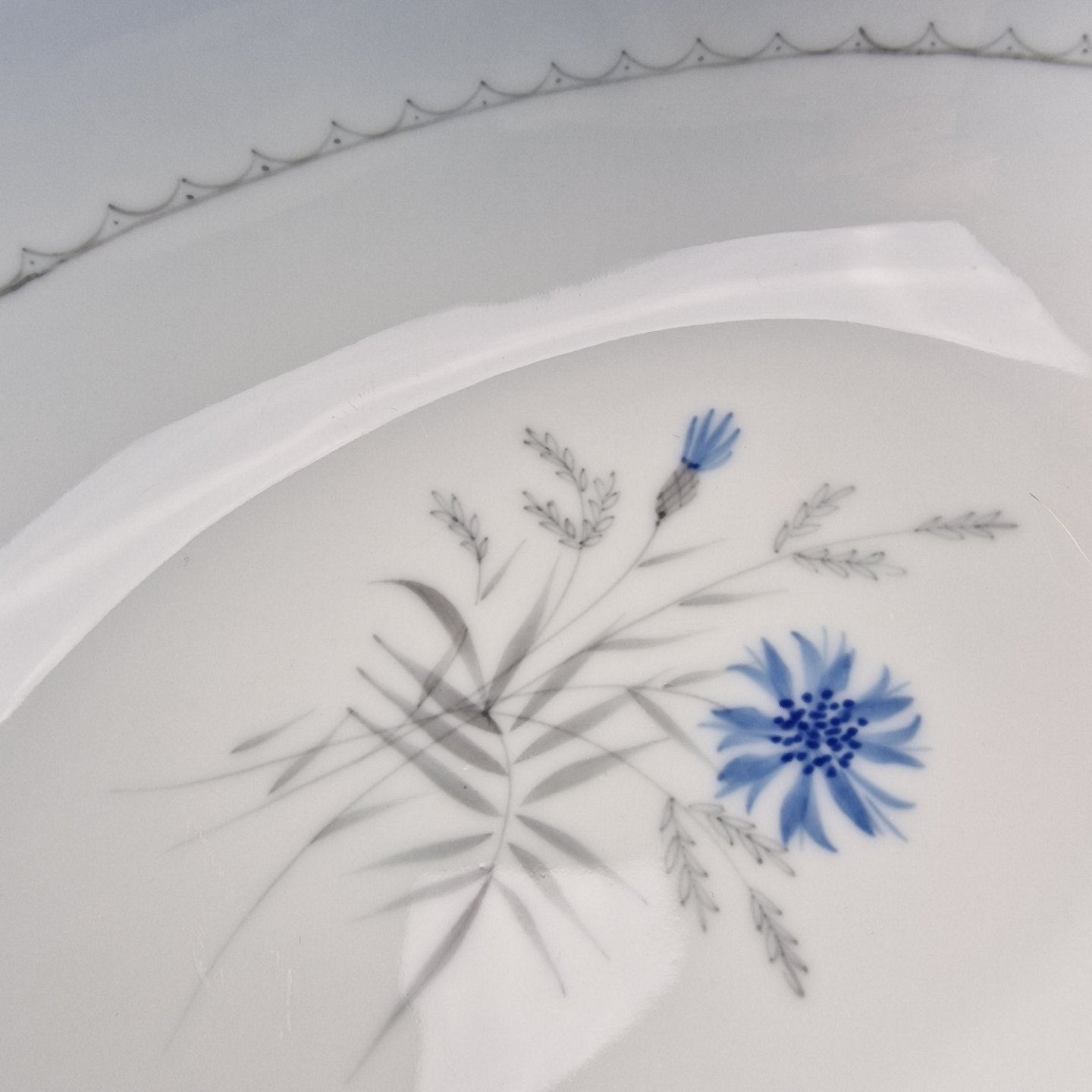 Demeter er af hvidt porcelæn med graduering af blå i kanten og med motiv af kornblomst