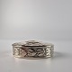 Oval sølvæske med motiv af en buket blomster og blomsterbort på siden