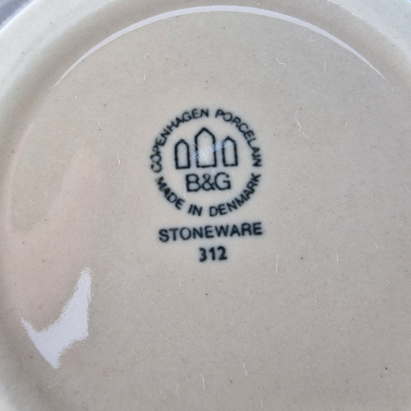 Stellet Peru er af stentøj, glaseret med lys grå farve og dekoreret med bånd af grøn/brunlige farve