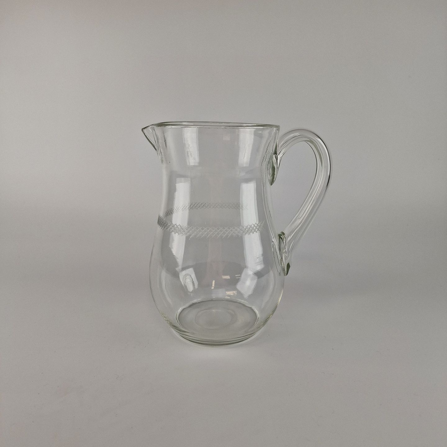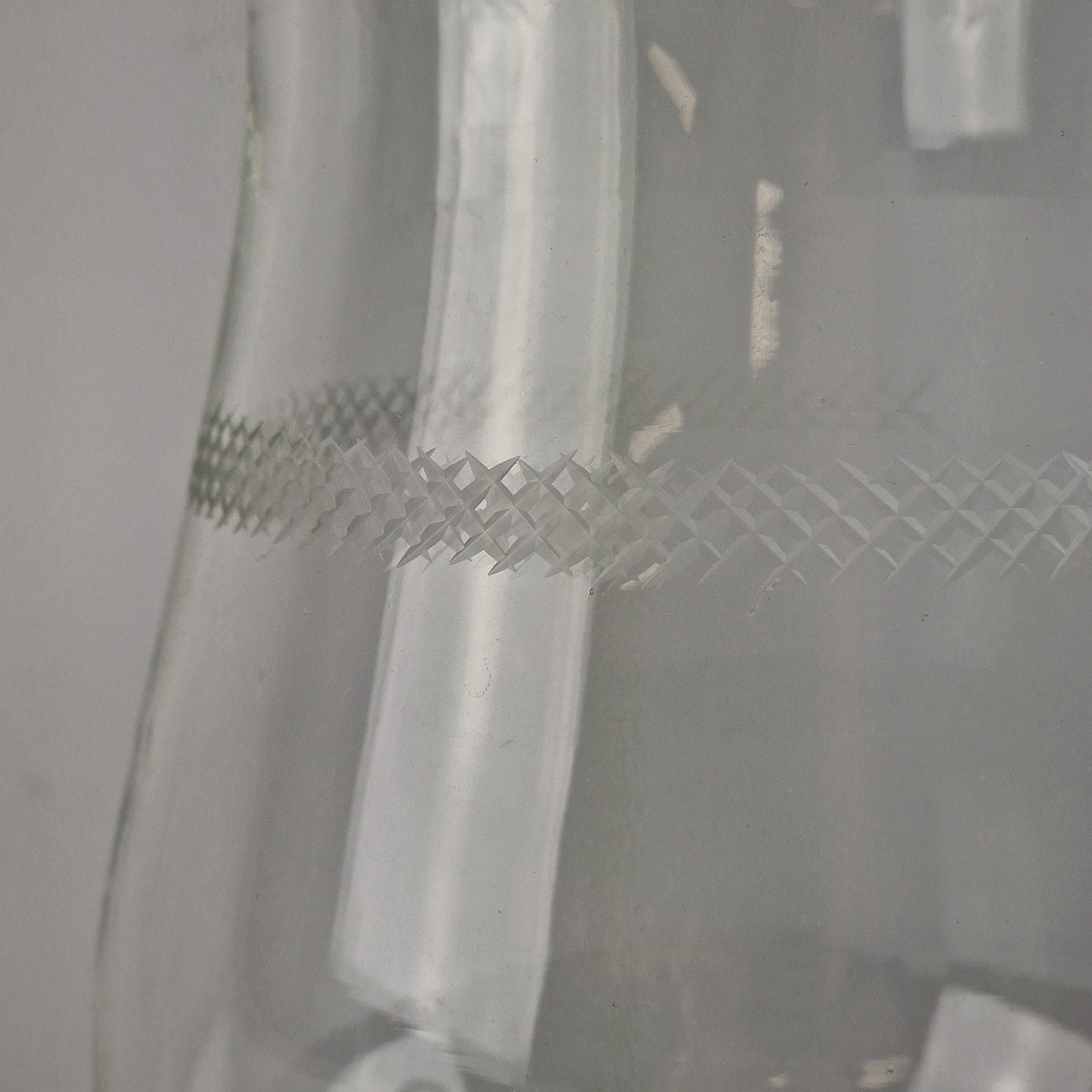 Mundblæst glaskande med krydsslibninger. Tilhørende glasstellet krydslebne med baluster stilk