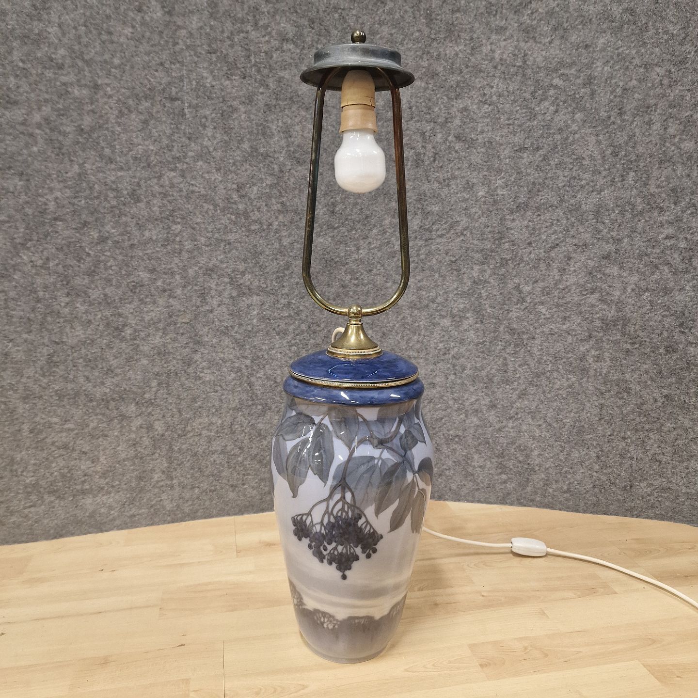 Bordlampe i grålige toner dekoreret med hyldebær på gren