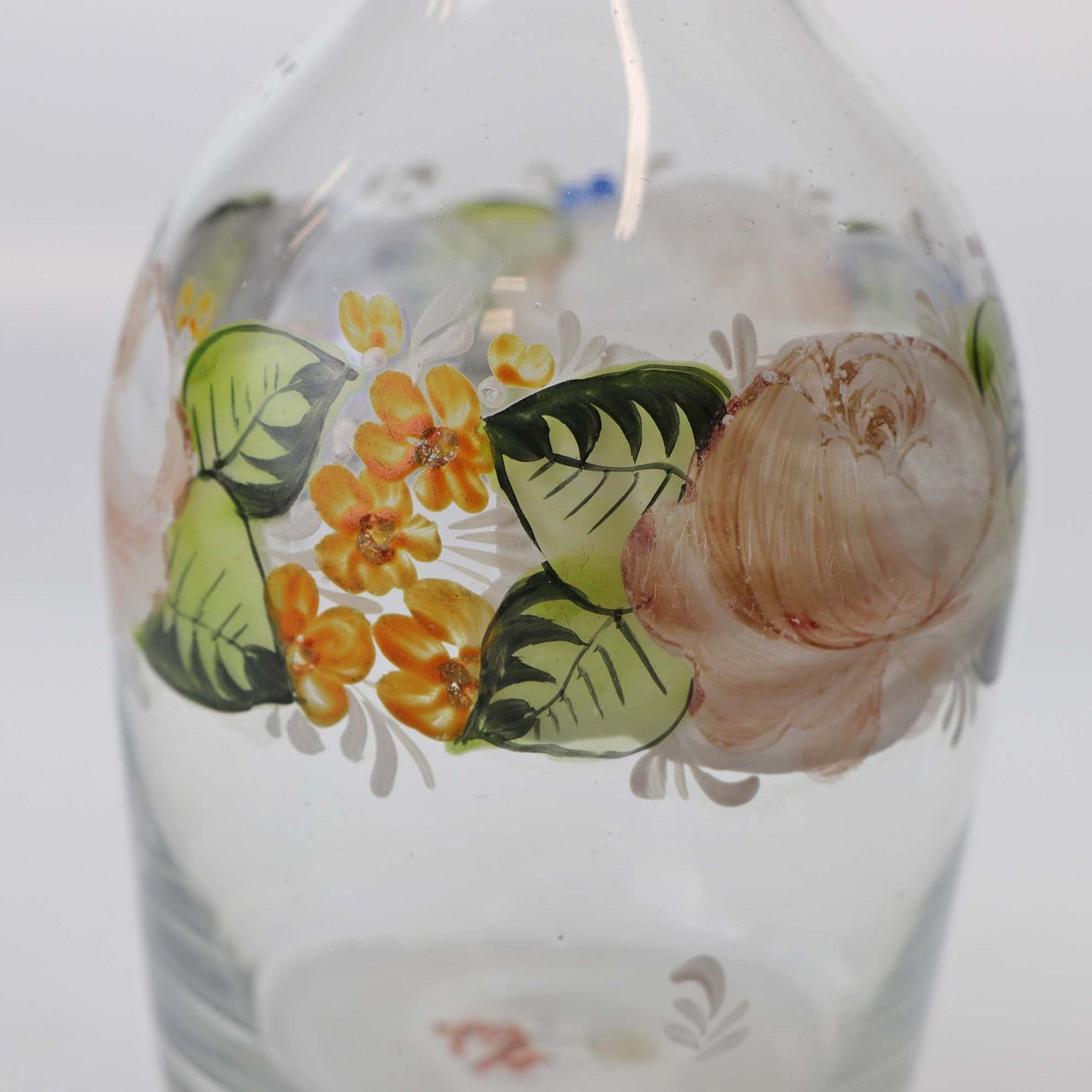 Karaffel dekoreret med blomster og blade af emalje maling.