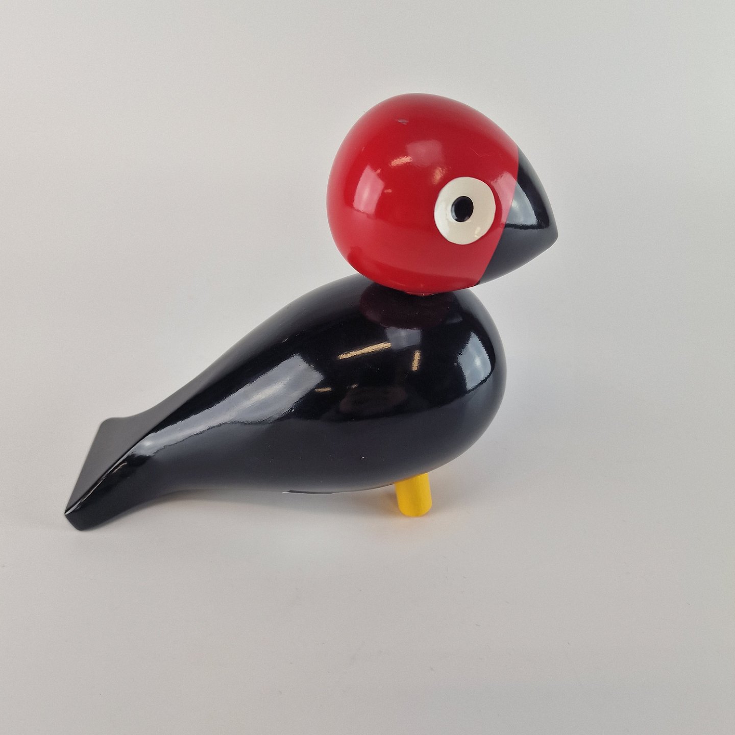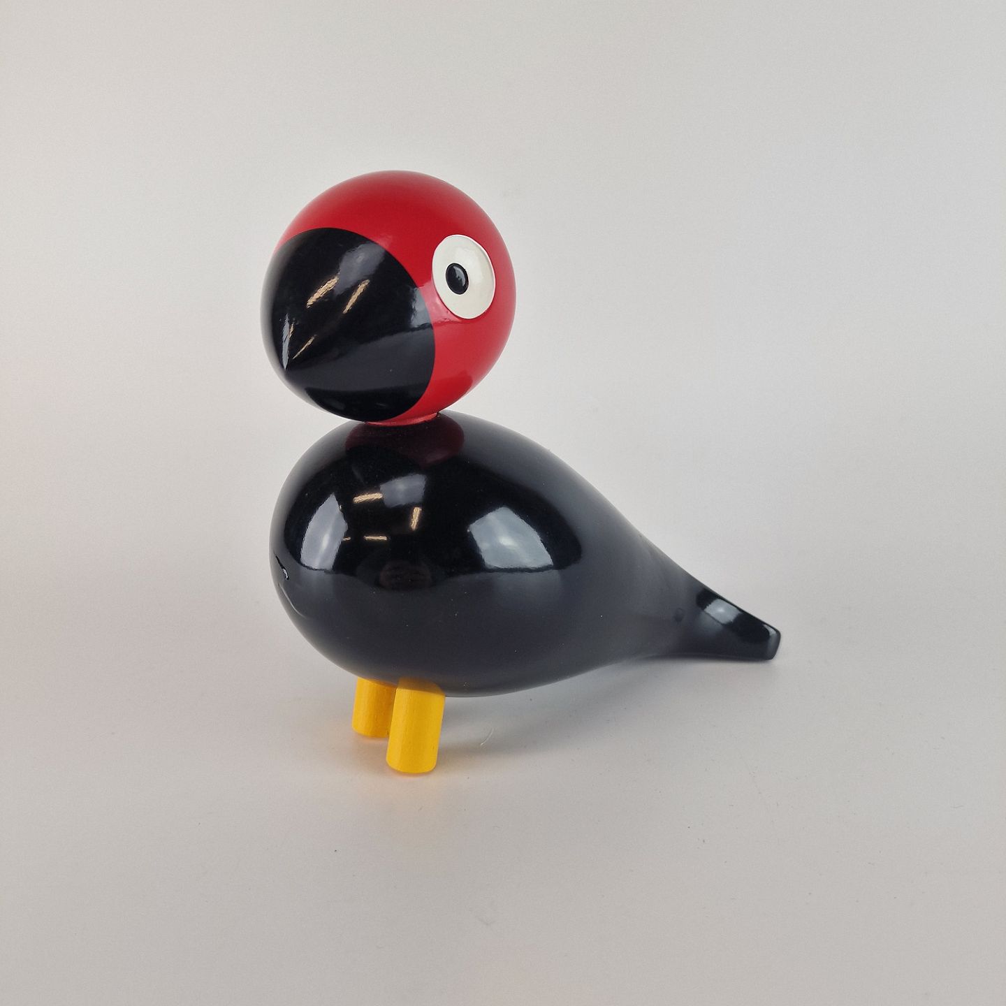 Figur af malet bøgetræ fra serien Sangfugl. Peter har sort krop, rødt hoved, sort næb og gule ben.