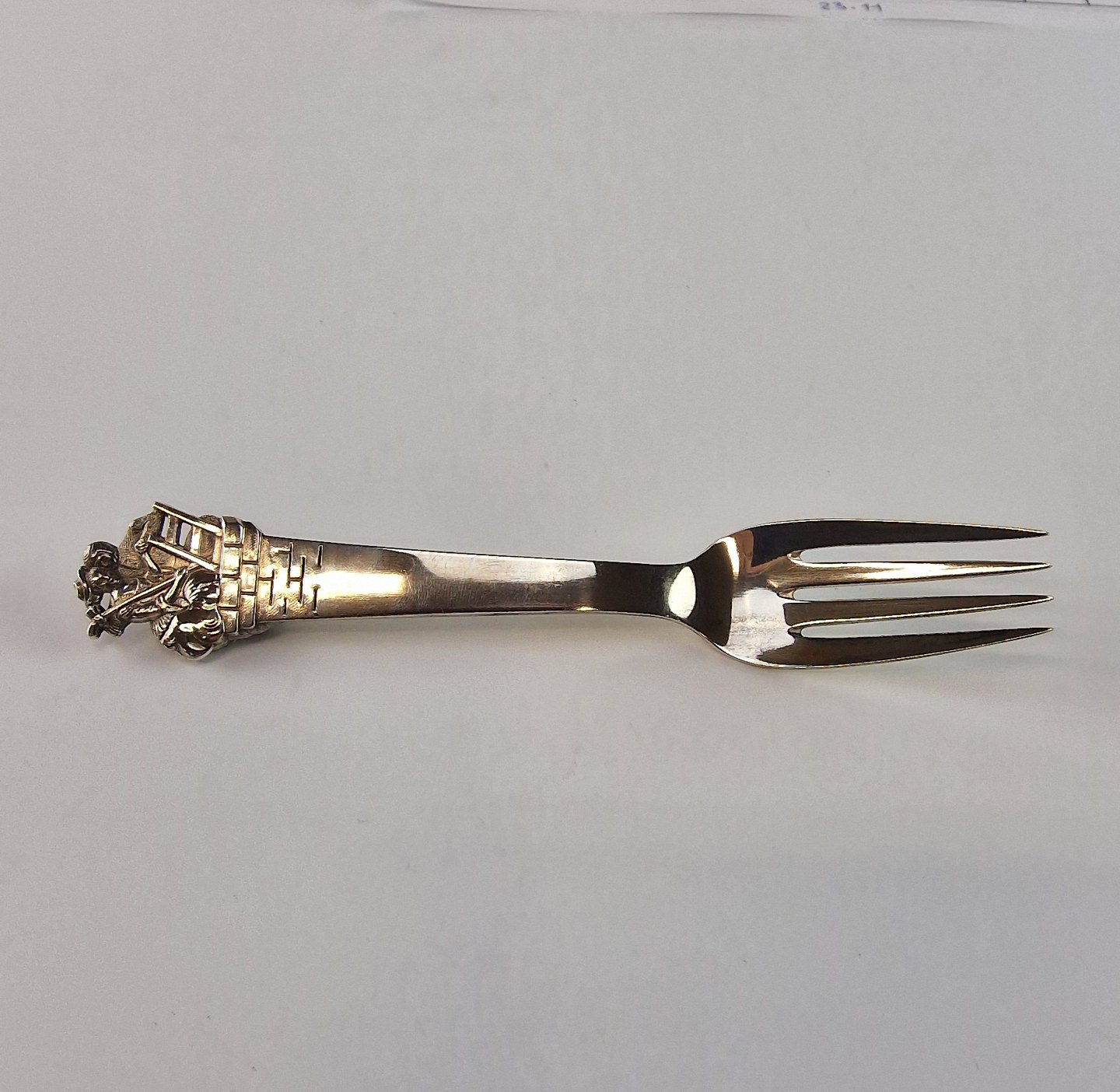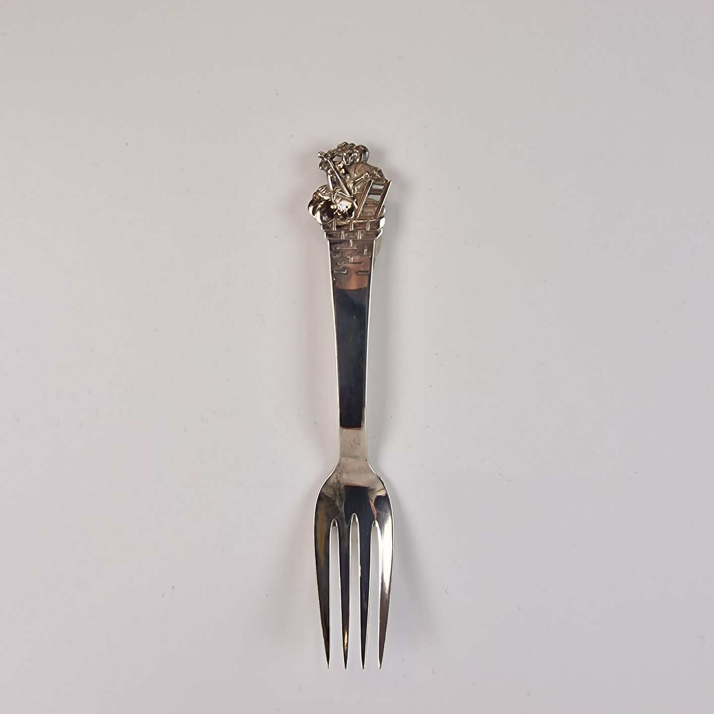 H.C. Andersen barnegaffel i sølv. Med motiv fra eventyret Hyrdinden og skorstensfejeren. År 1946