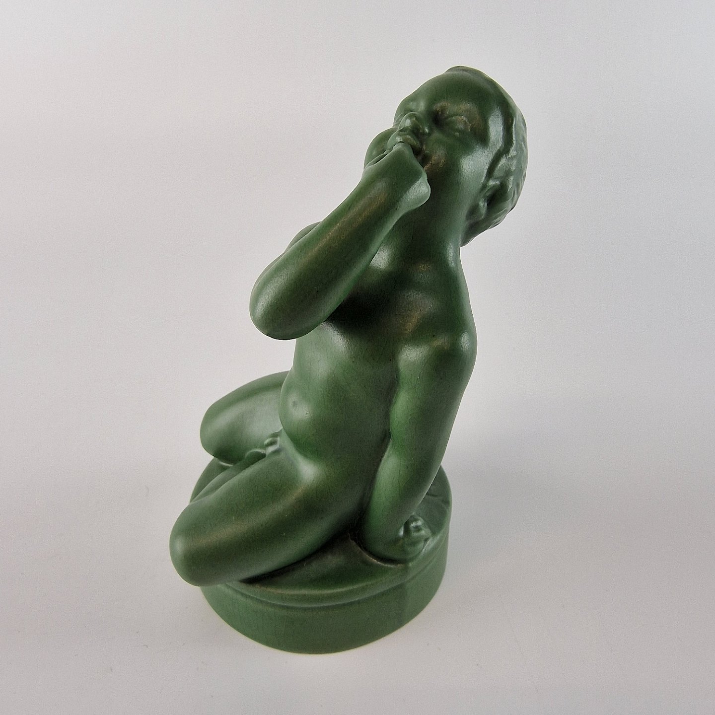 Grøn keramik figur af en dreng som sidder med finger i mund