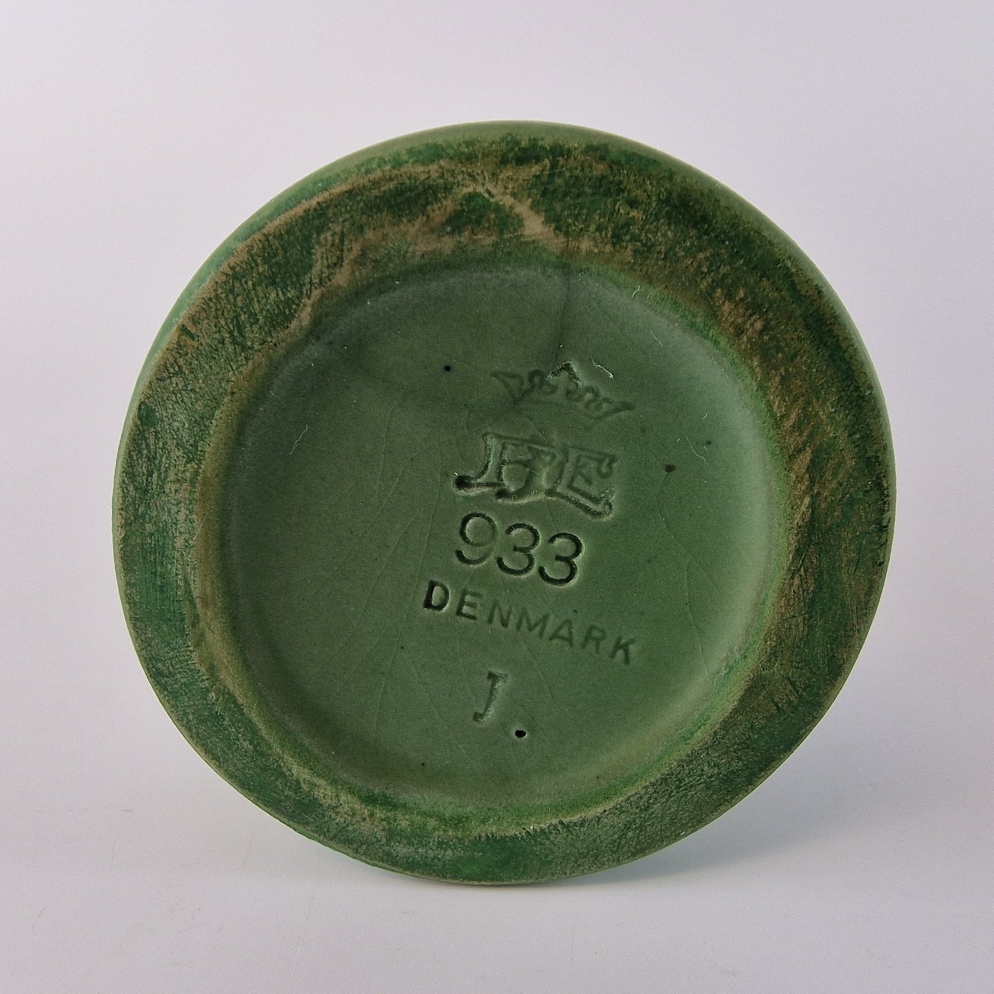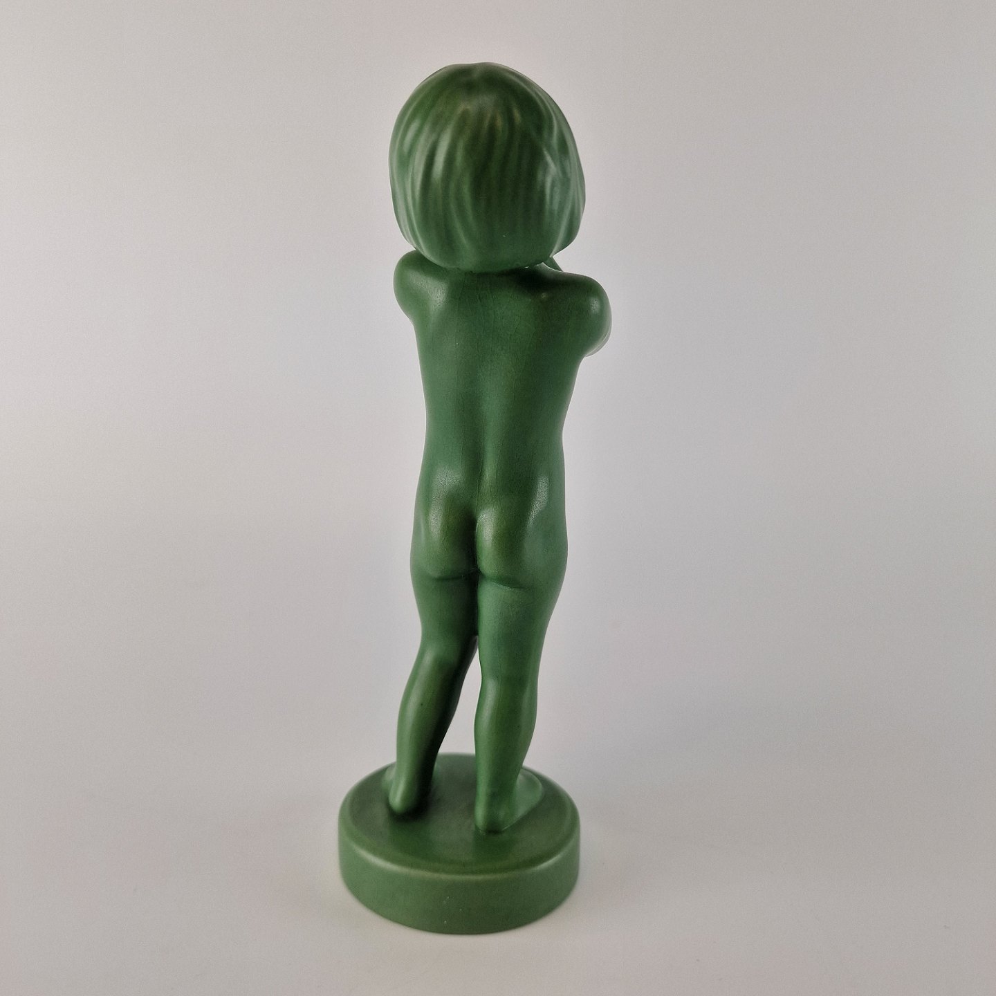 Grøn keramik figur af pige, som sminker sig og med et spejl i hånden. Nr 933