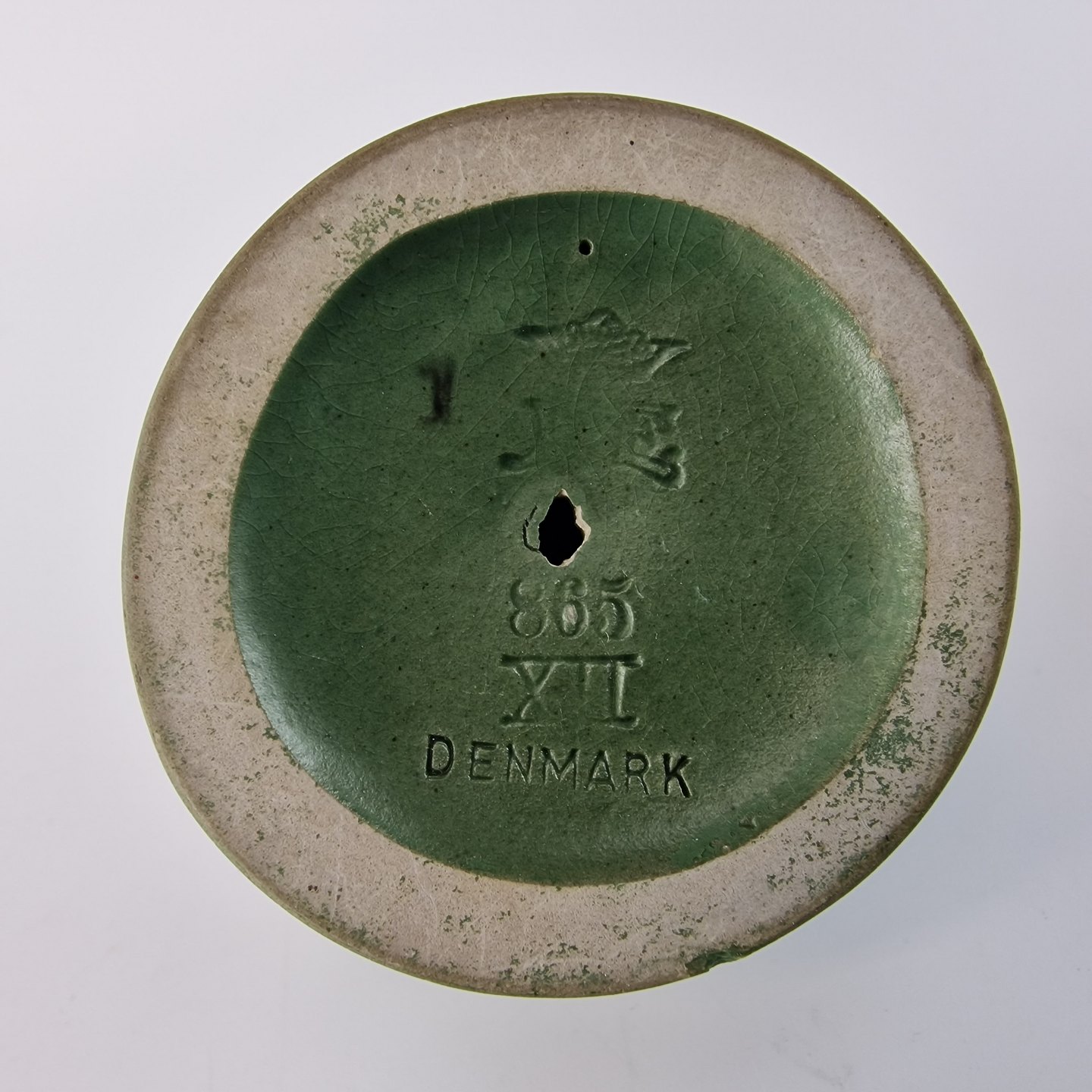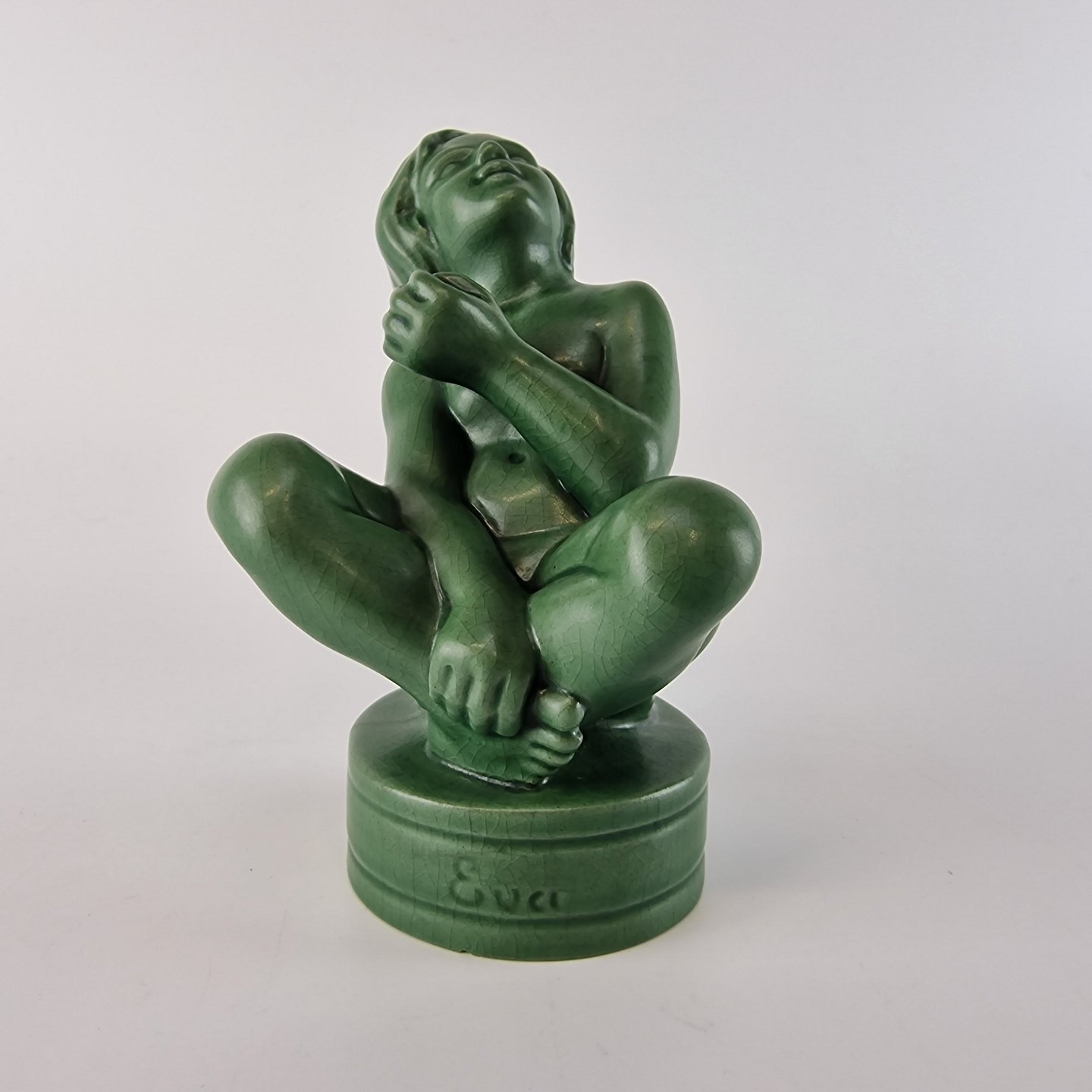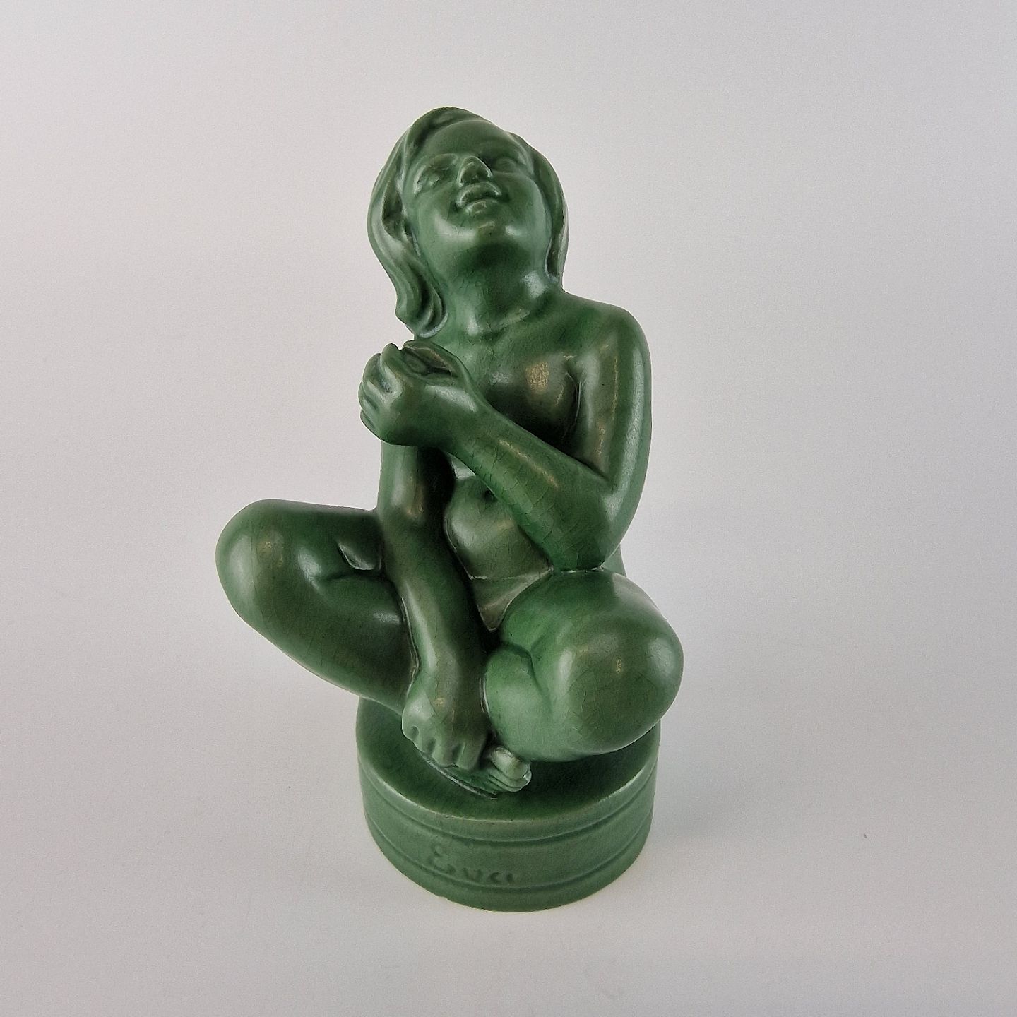 Grøn glaseret keramik figur af siddende pige, som kigger opad