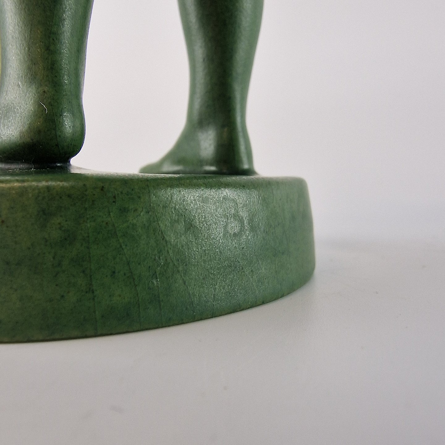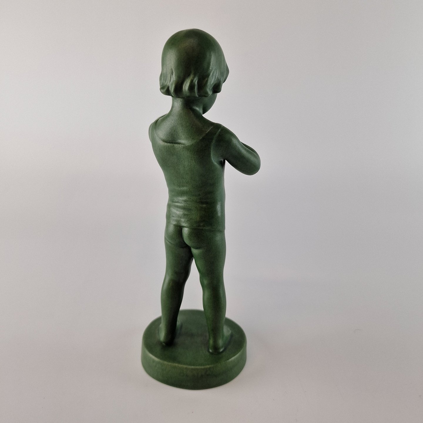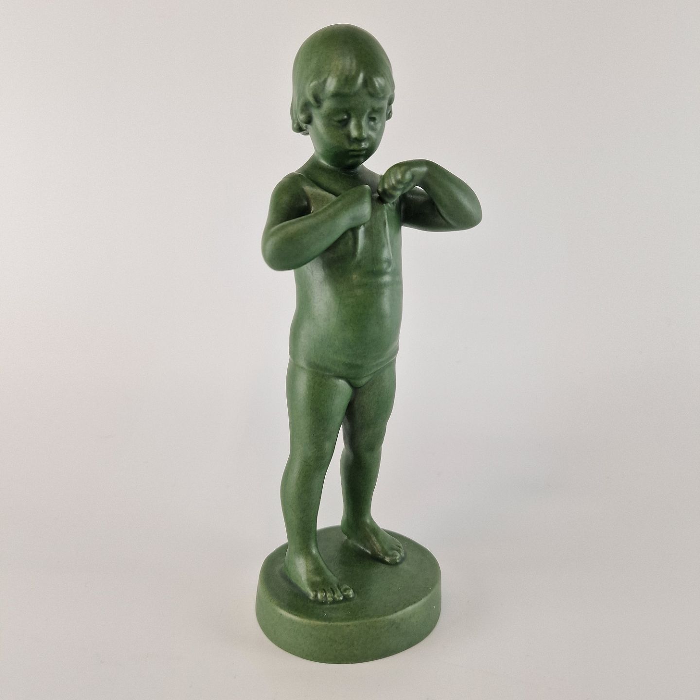 Grøn glaseret keramik figur af pige, som binder sin skjorte. No 893