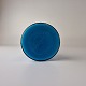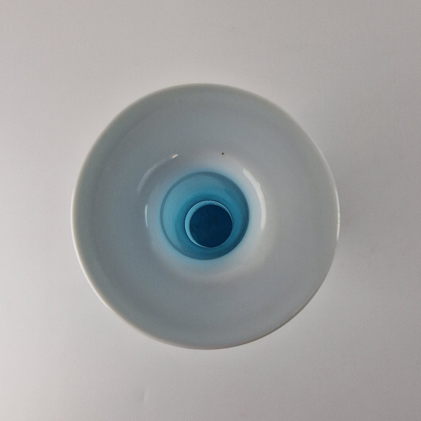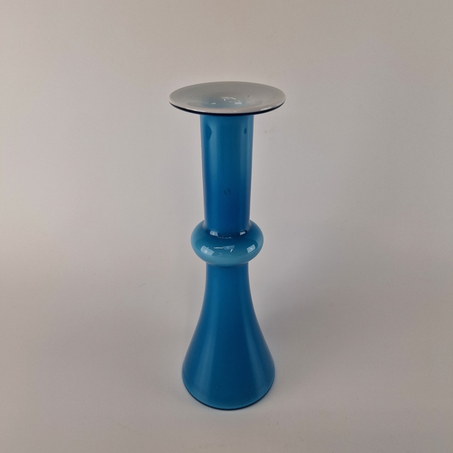 Vase i opalhvidt mundblæst glas med blåt overfang. Vasen kan også bruges som lysestage.