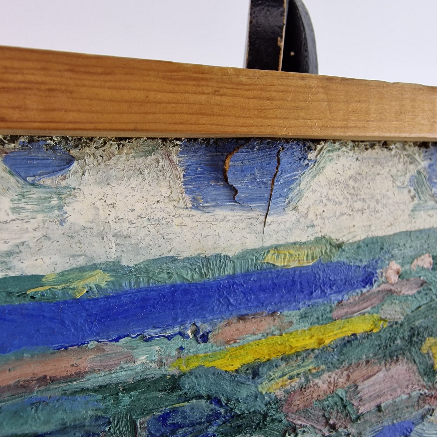 Oliemaleri på plade med abstrakt landskabsmaleri med motiv af udsigt over marker, søer og enge