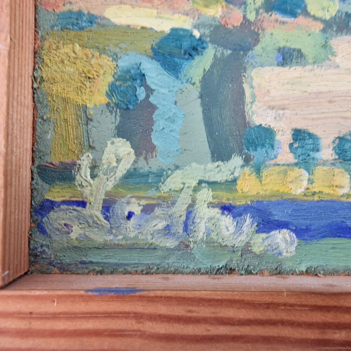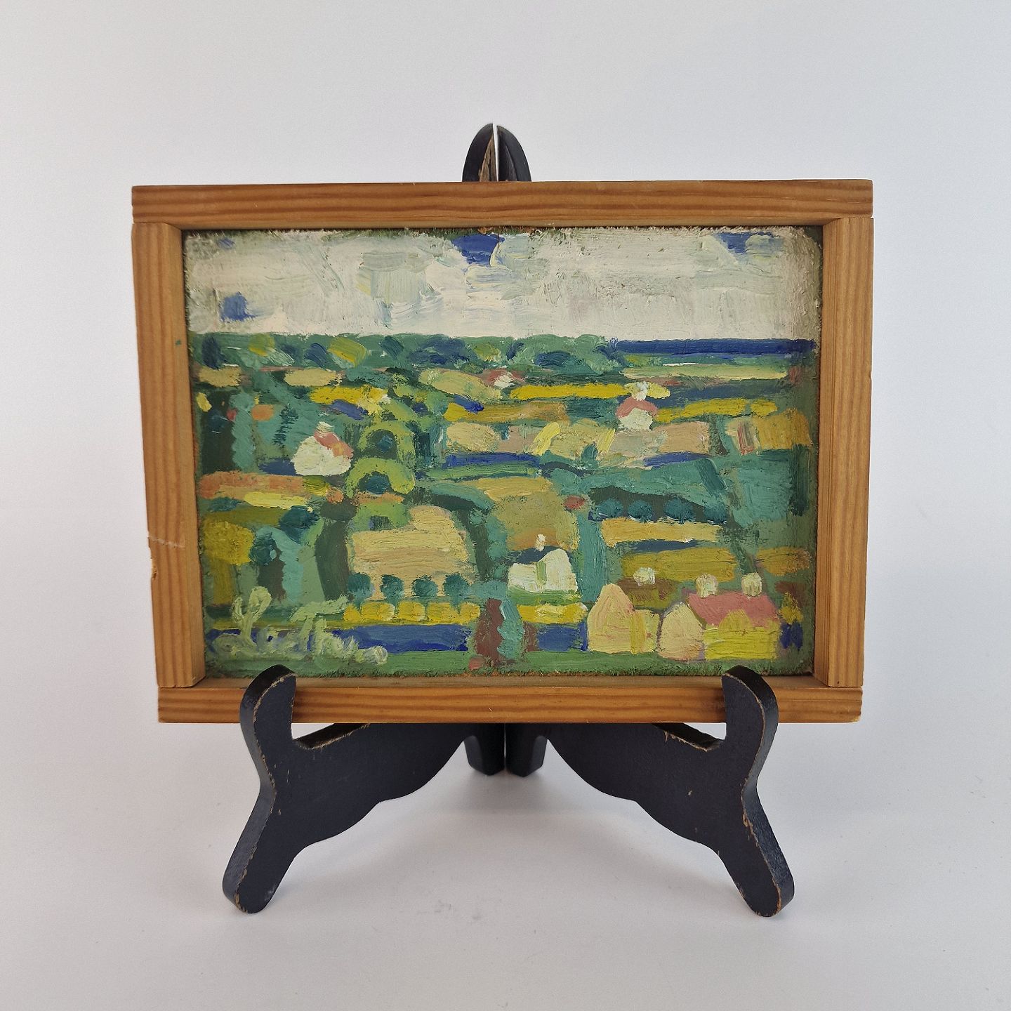 Oliemaleri på plade med abstrakt landskabsmaleri med motiv af huse placeret mellem marker og enge