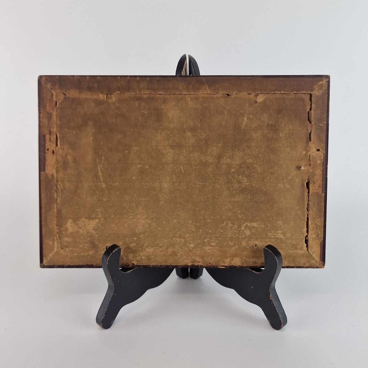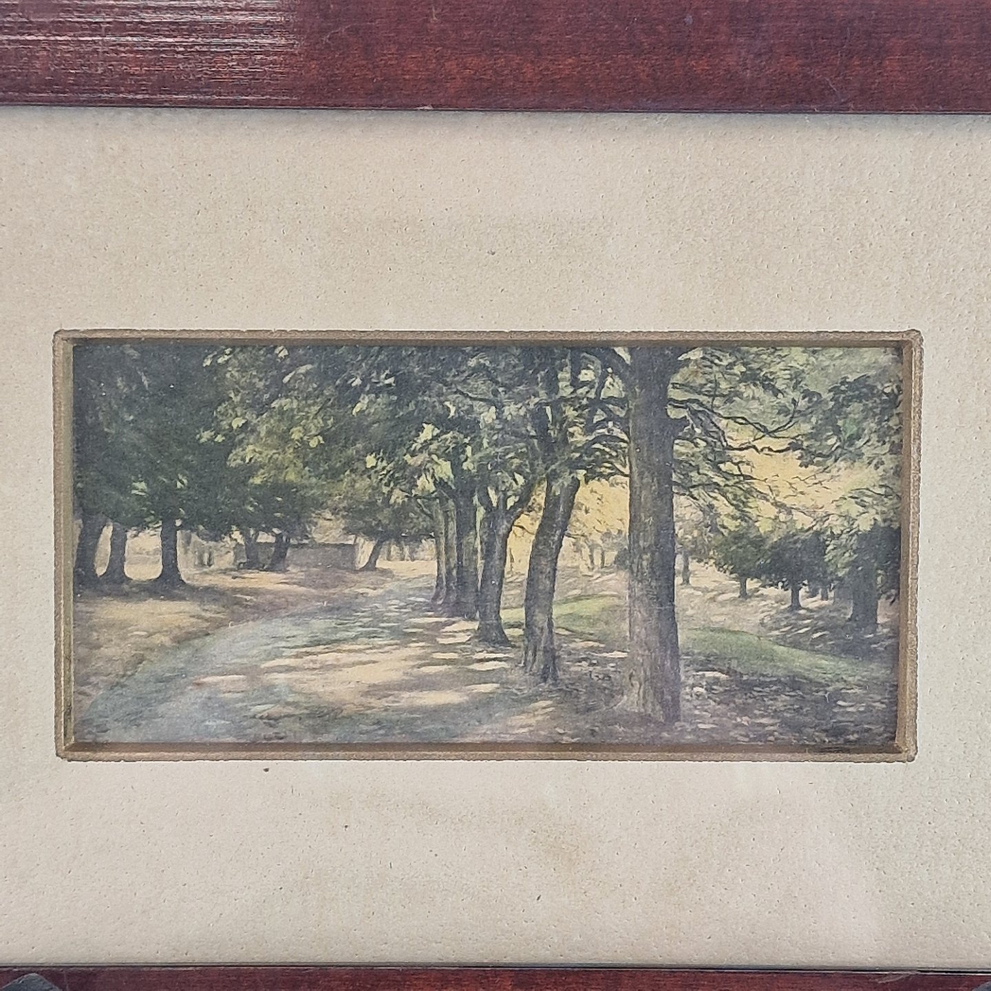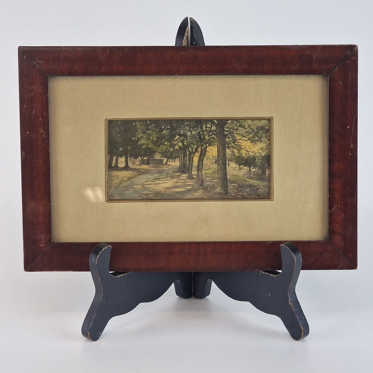 Indrammet landskabsmaleri i passepartout med motiv af et landskab, hvor en smal sti omgivet af træer fører beskueren frem til en lille hytte i det fjerne.