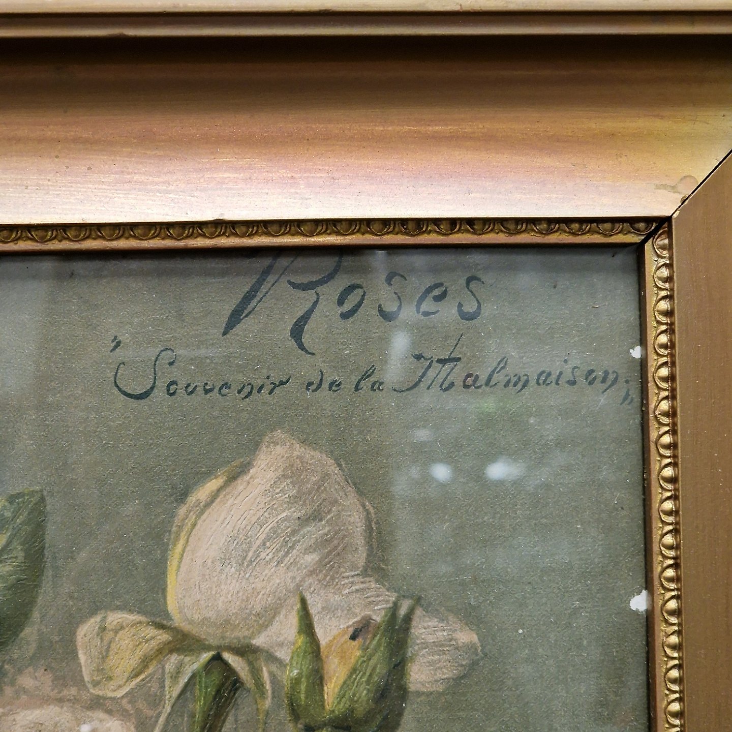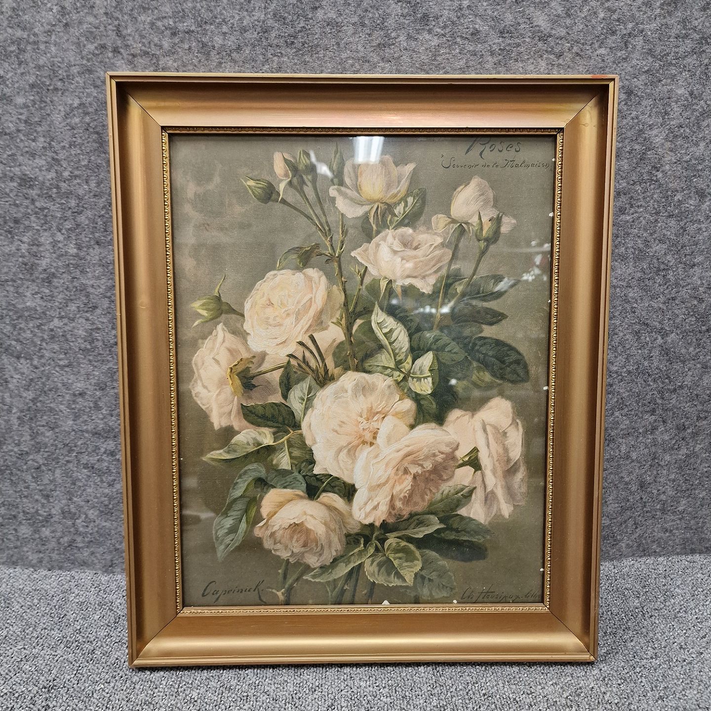Indrammet tryk i gylden træramme. Tryk med motiv blomsterbuket af rosearten Souvenir de la Malmaison også kendt under navnet Bourbonrosen