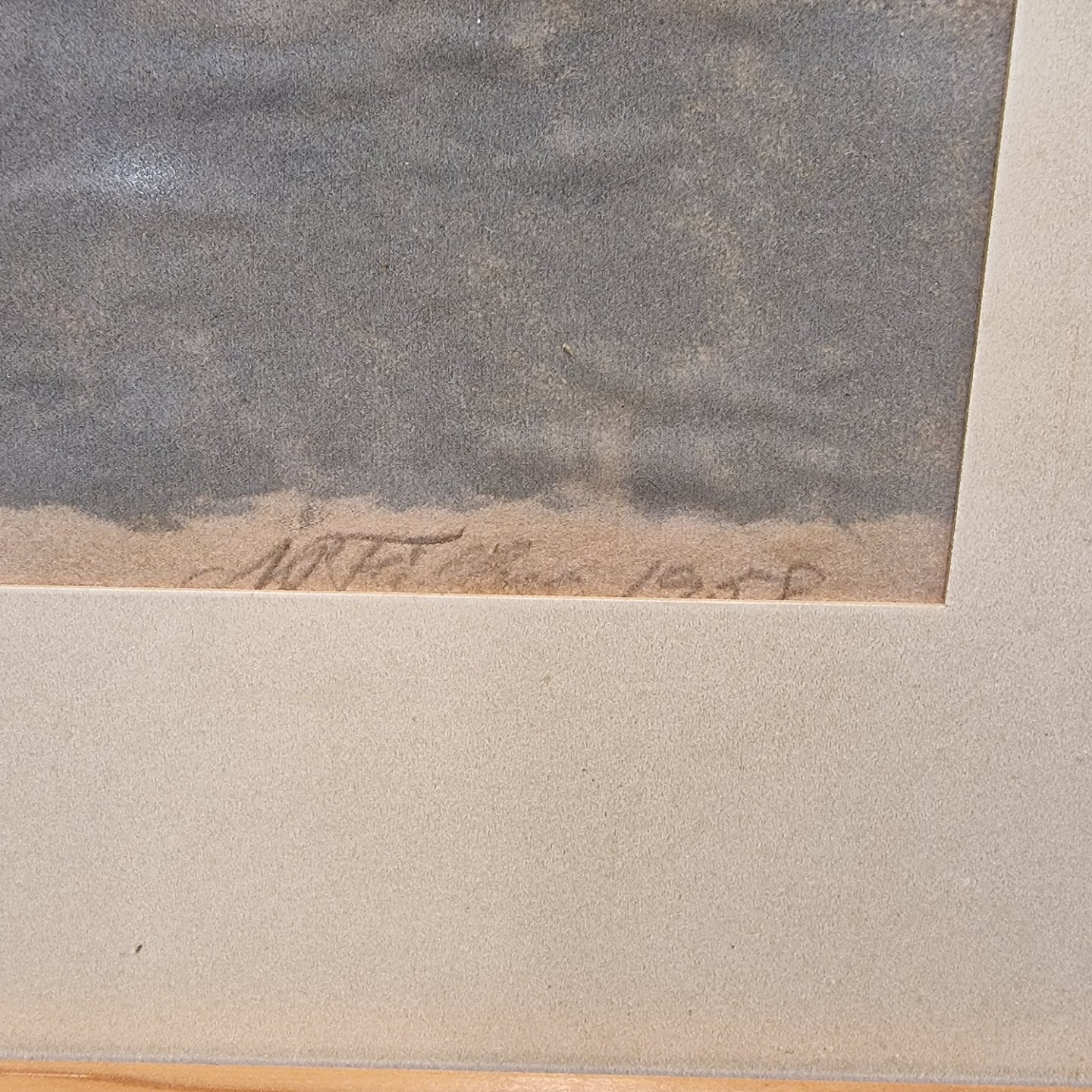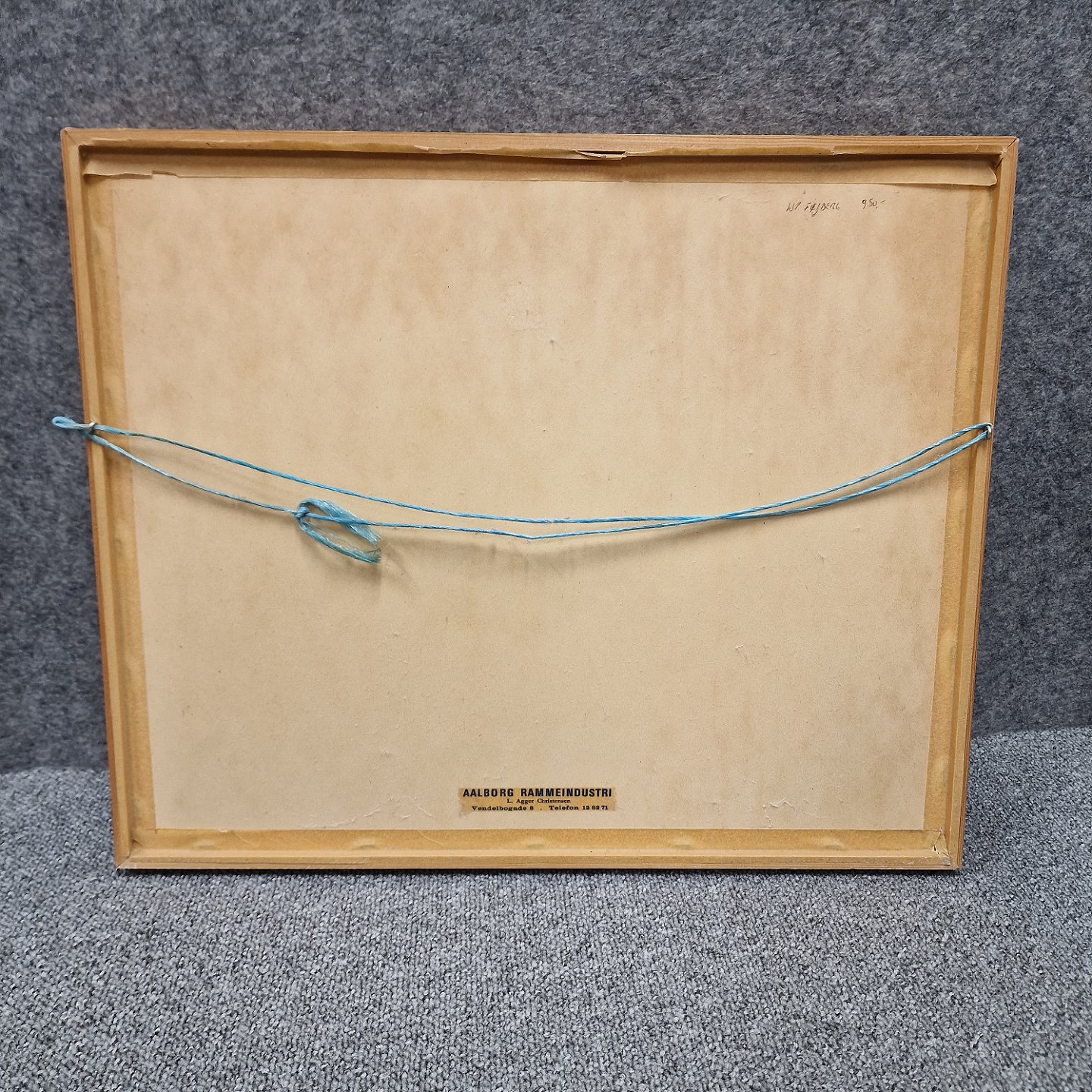 Indrammet maleri på papir i passepartout med træramme. Eksteriørmaleri med motiv af baggårdsmiljø med porte