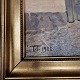 Oliemaleri på lærred i gylden træramme. Naturalistisk områdeportræt af ældre stråtægt bondehus med bevoksning op ad husmuren.