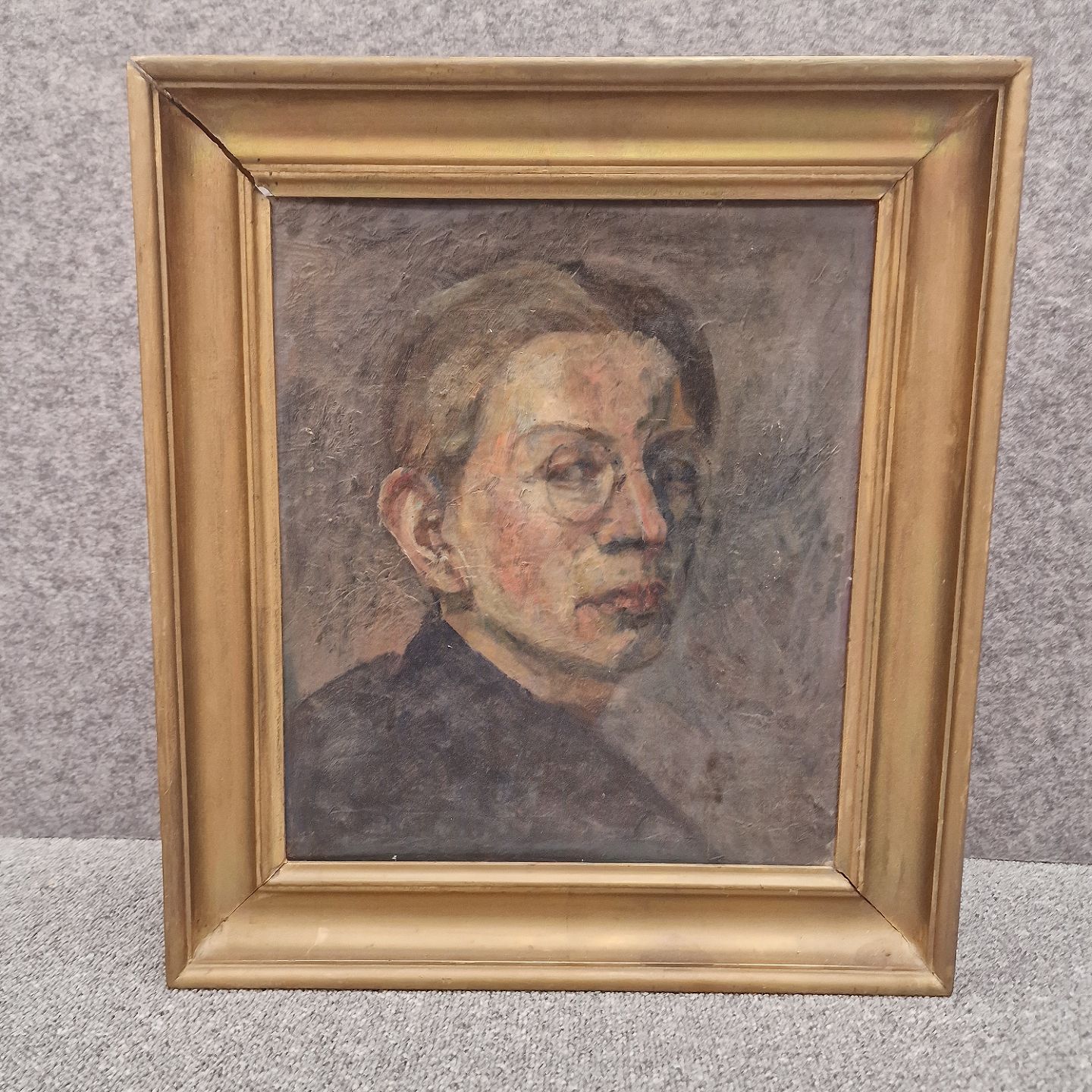 Oliemaleri på plade i gylden træramme. Portrætmaleri af yngre person med runde briller.