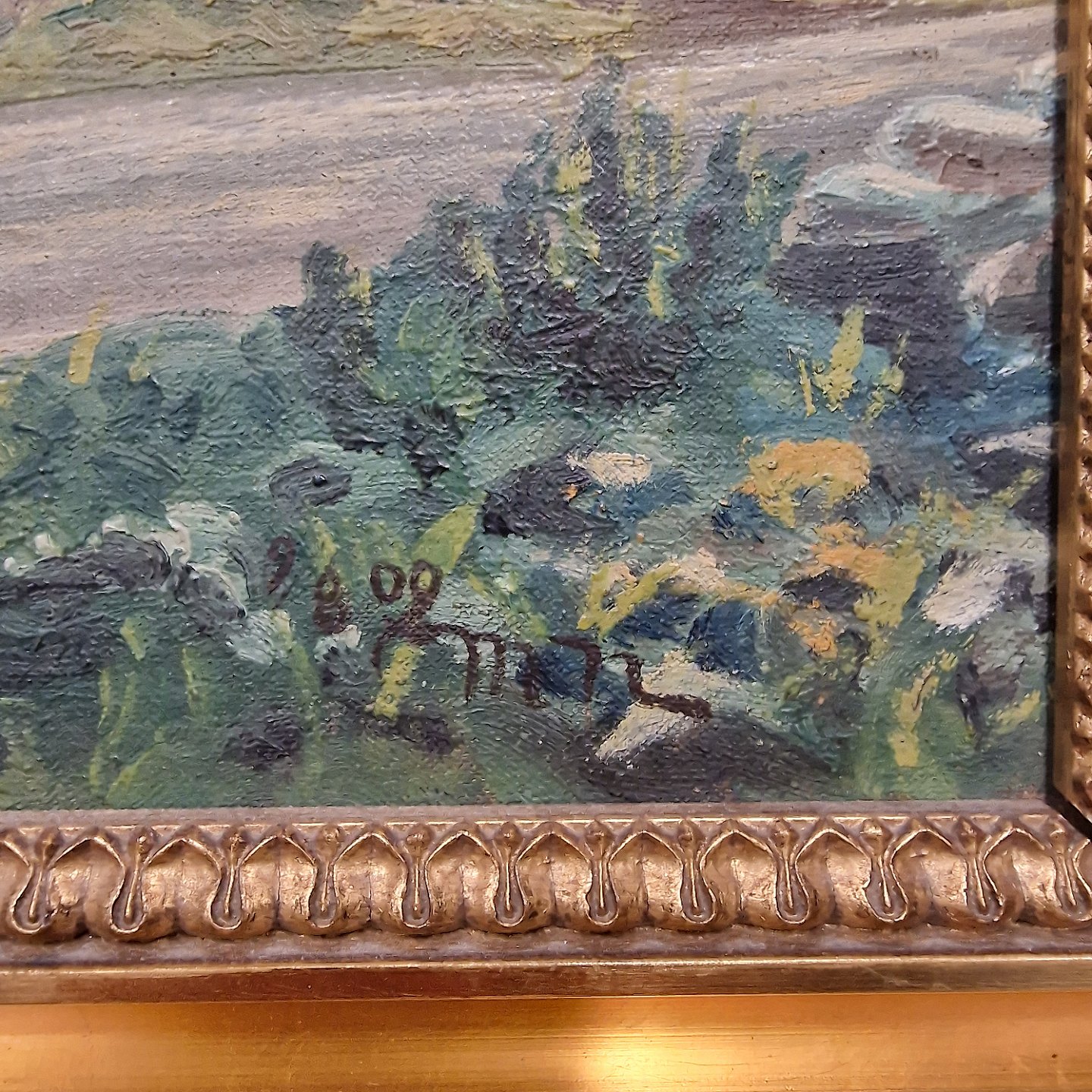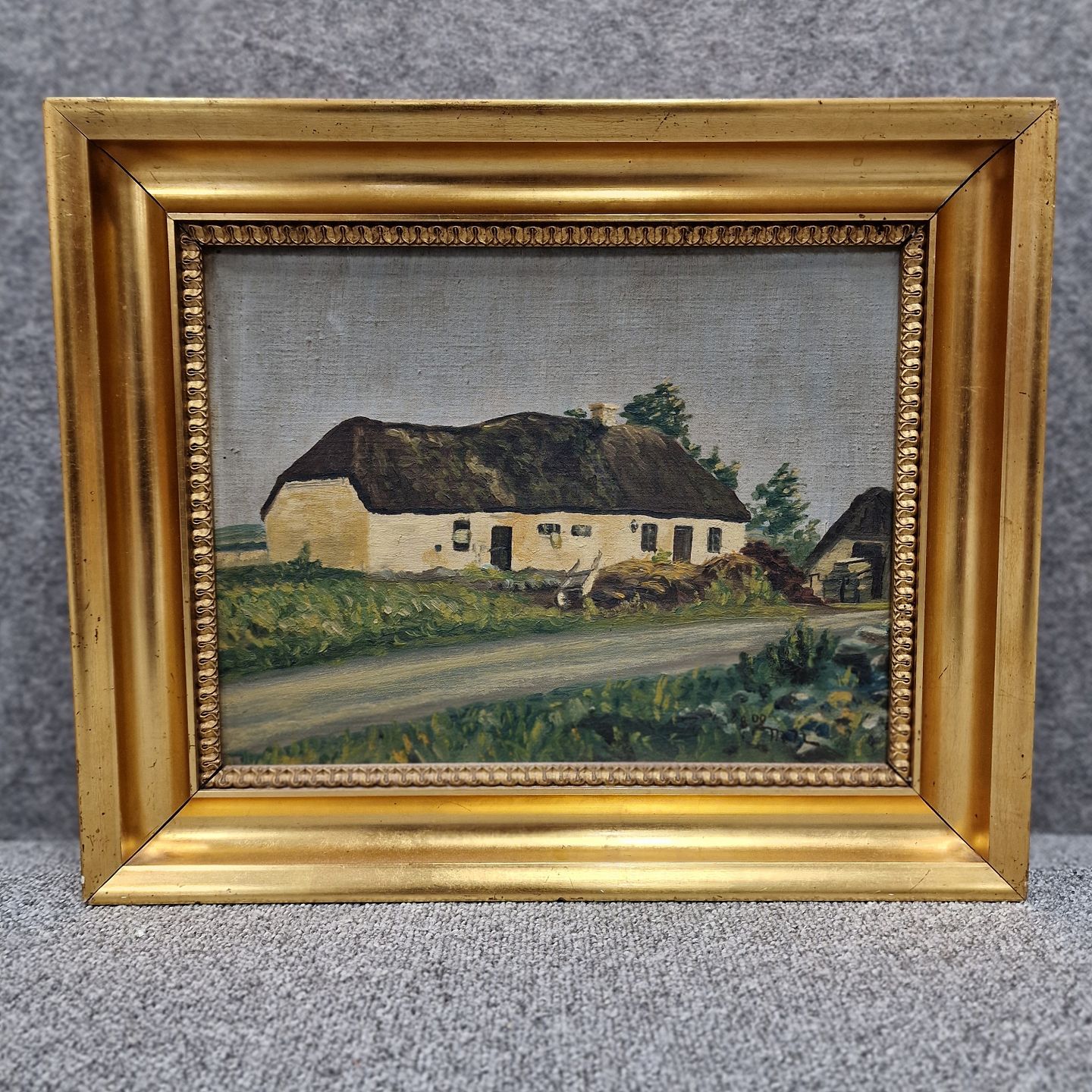 Oliemaleri på lærred med gylden træramme. Landskabsmaleri med motiv af ældre bondegård beliggende tæt på vej