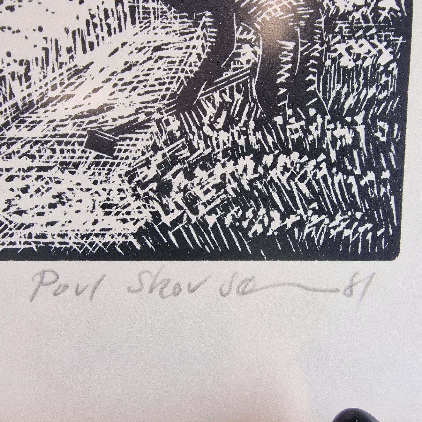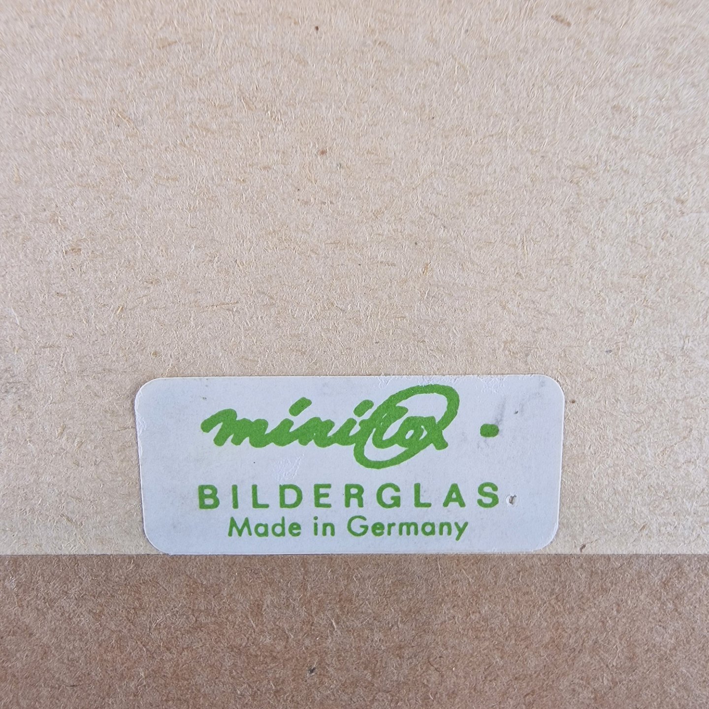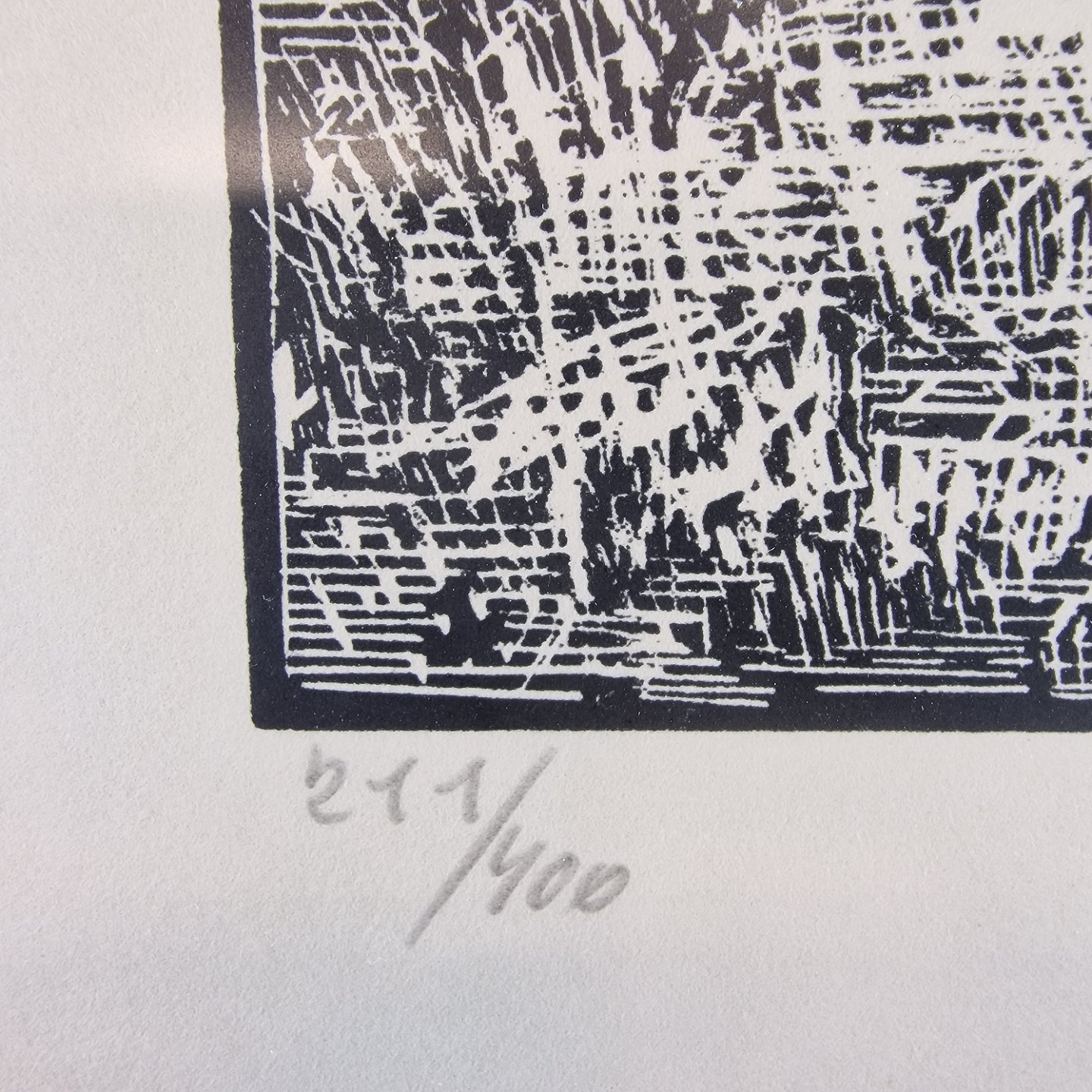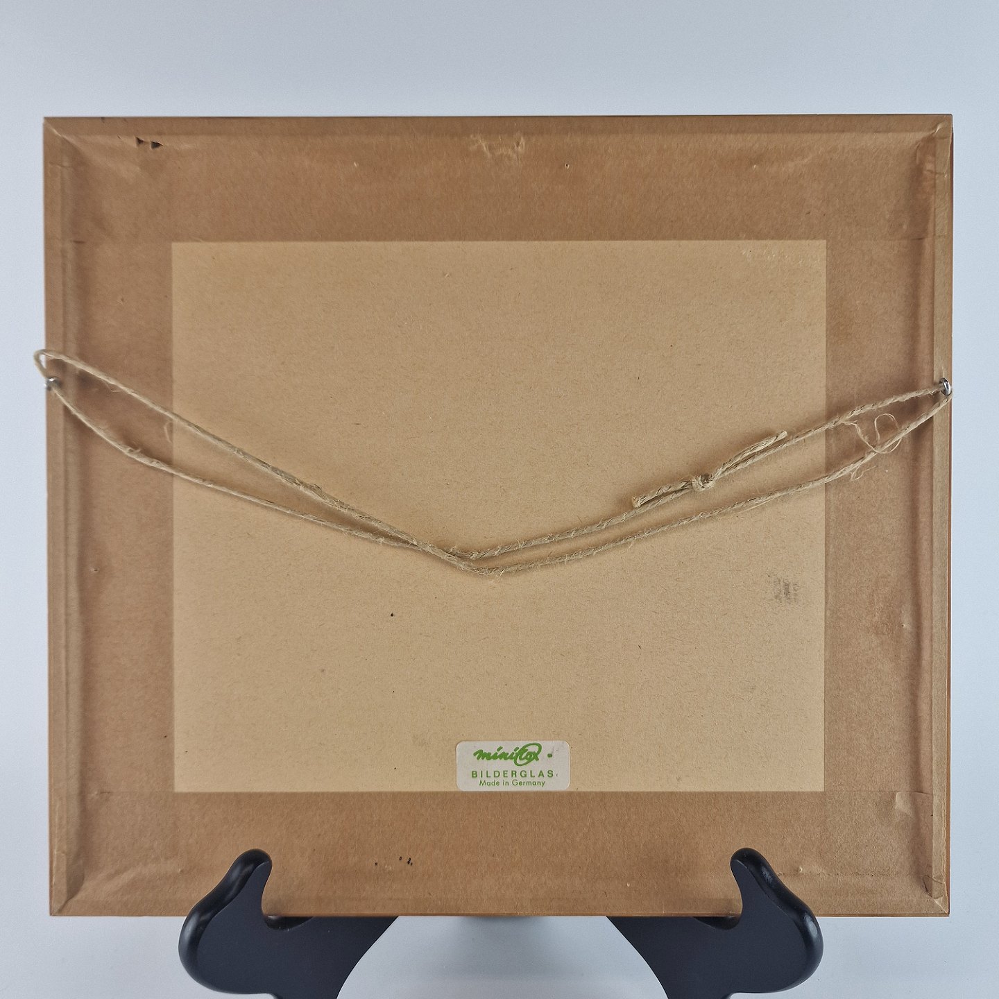 Indrammet træsnit i træramme med motiv af gangvej ledende op til hus med by i baggrunden nr 211/400