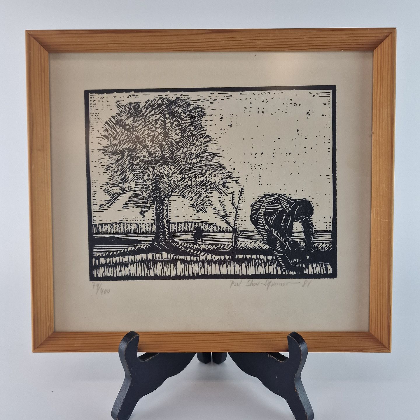 Indrammet Træsnit i træramme med motiv af en arbejder i marken nr 74/400