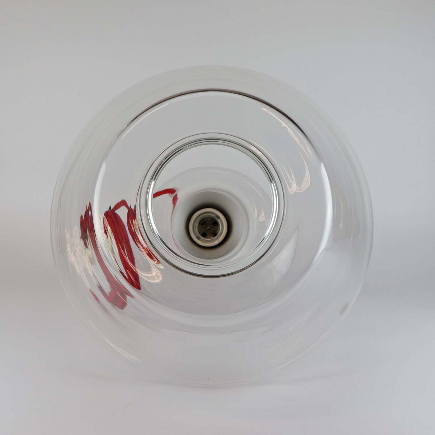 Bordlampe i mundblæst klart glas med rød stofledning. Størrelse Stor