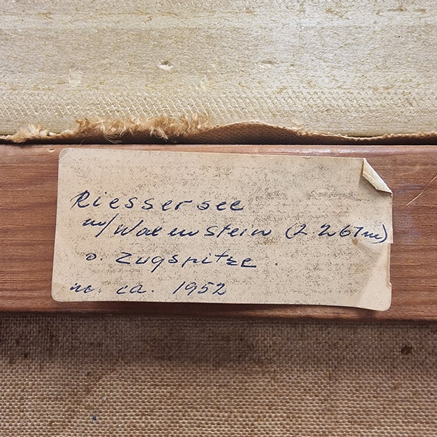 Maleri af landskab. Tekst på bagside: Riessersee, Waxenstein 1952