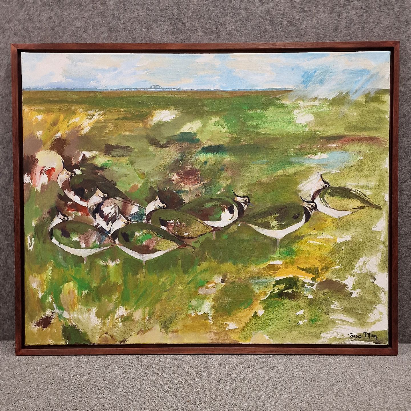 Oliemaleri på lærred med træramme. Landskabsmaleri med motiv af eng med viber stående i forgrunden
