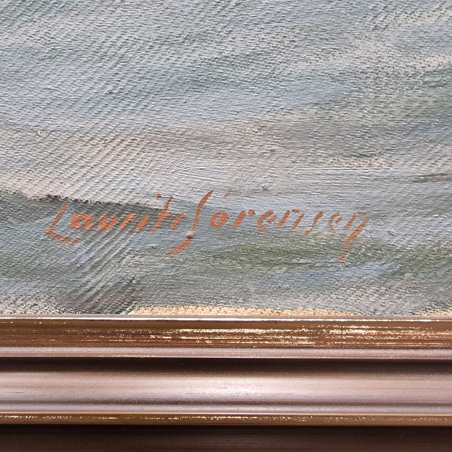Oliemaleri på lærred. Skibsmaleri af tremastet skonnert og mindre sejlbåd på havet