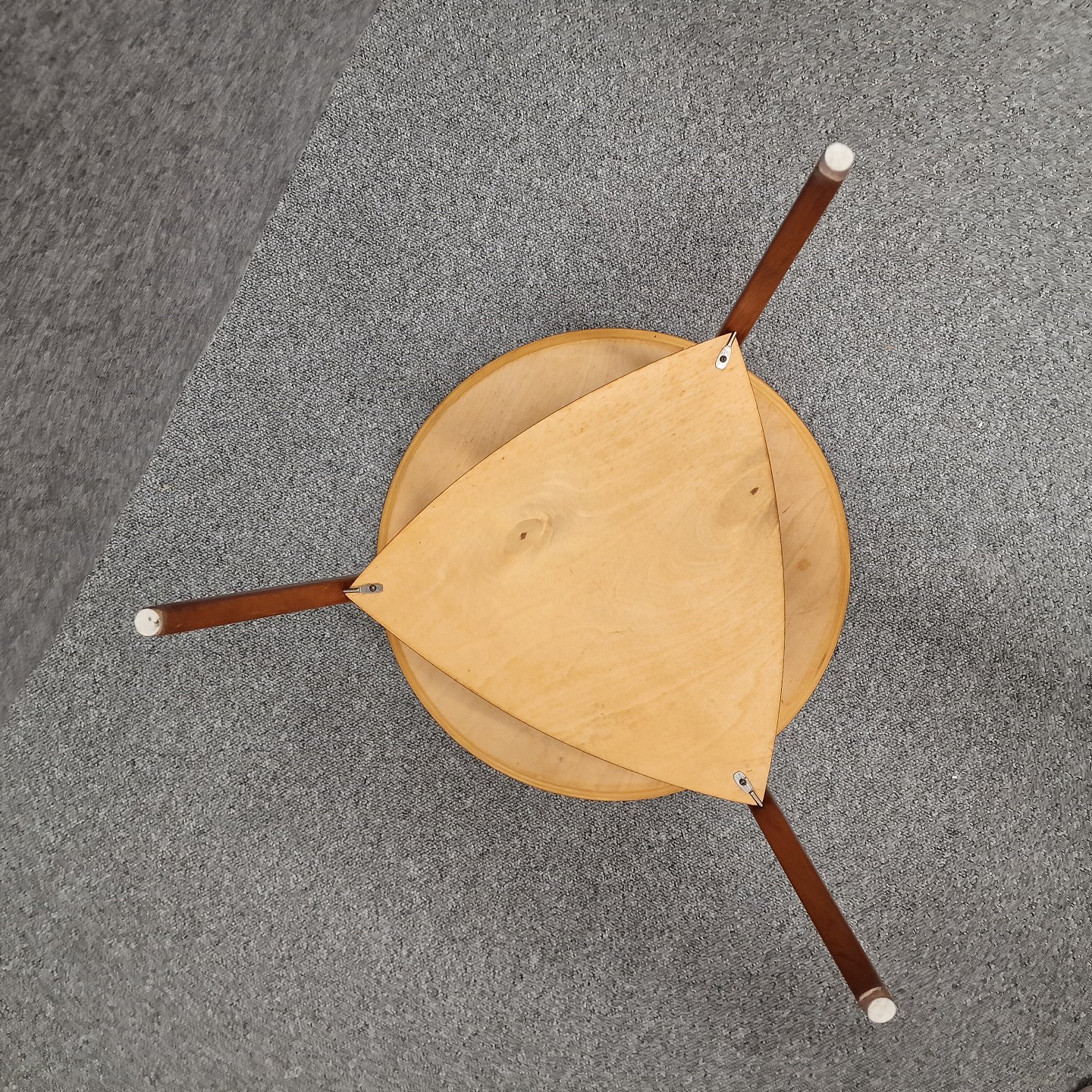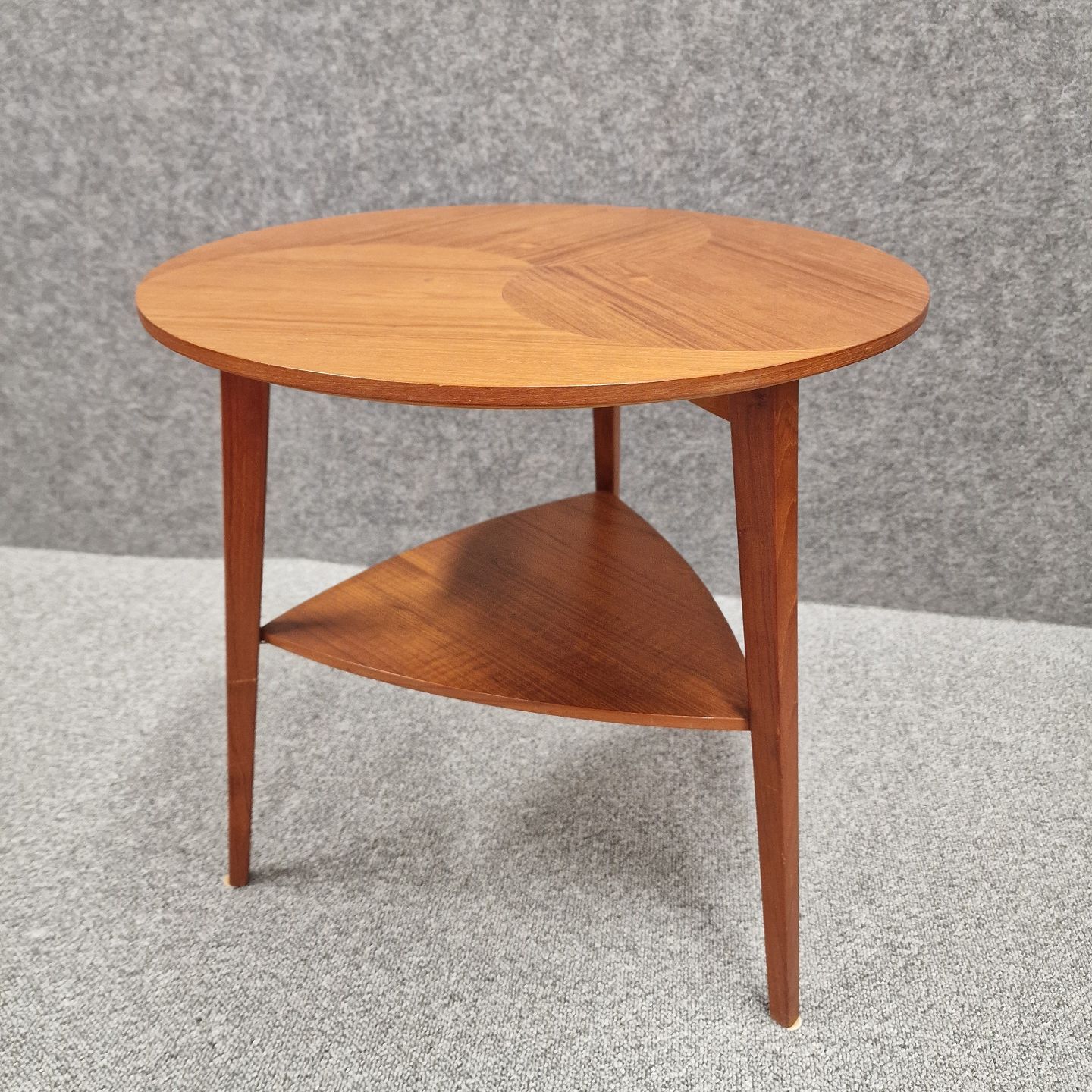 Rundt bord af teak, med 3 ben og trekantet hylde