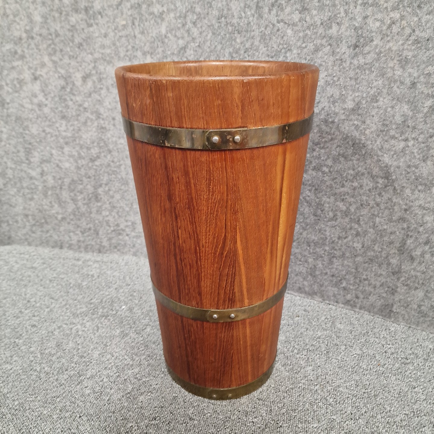 Paraply holder af teaktræ med spændebånd omkring