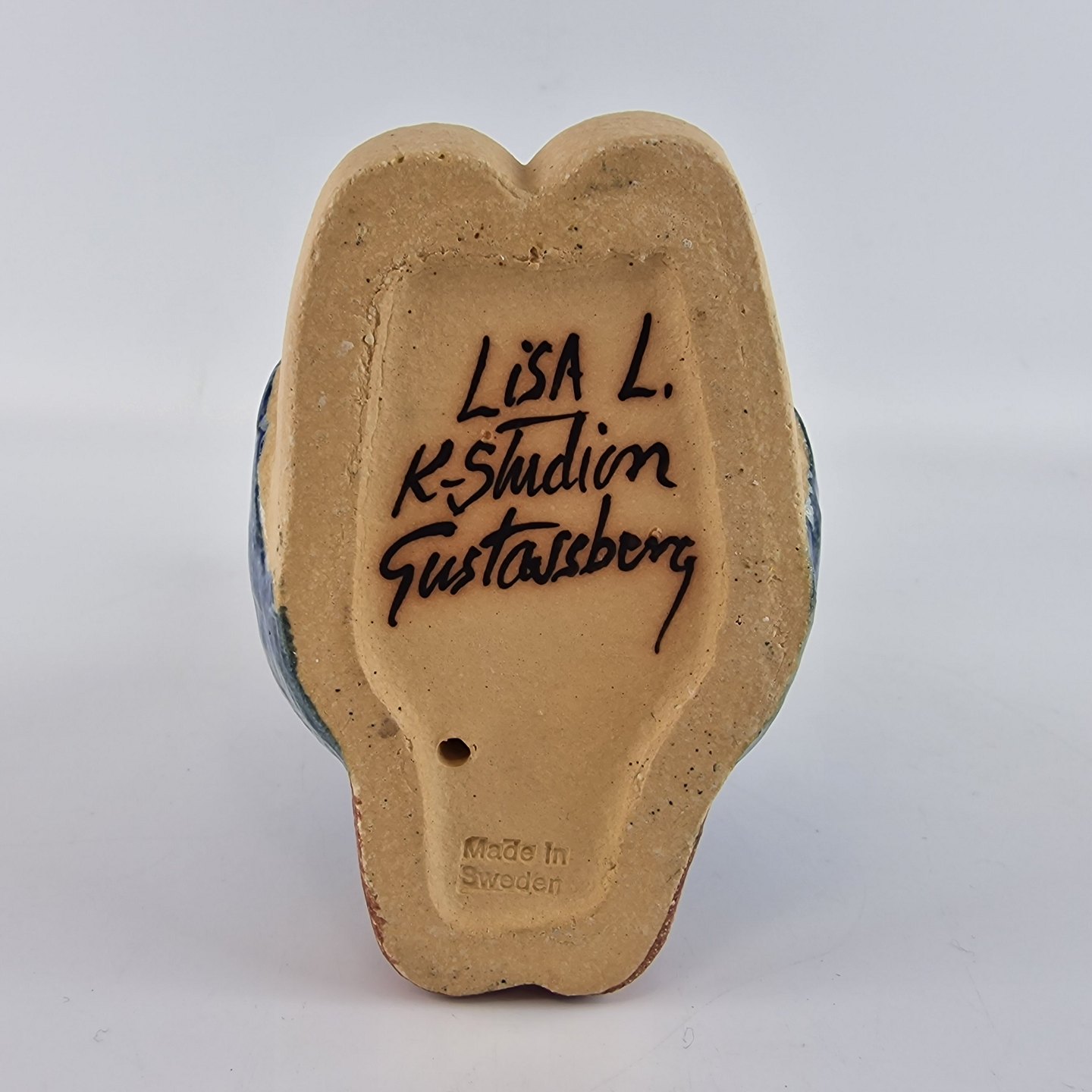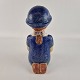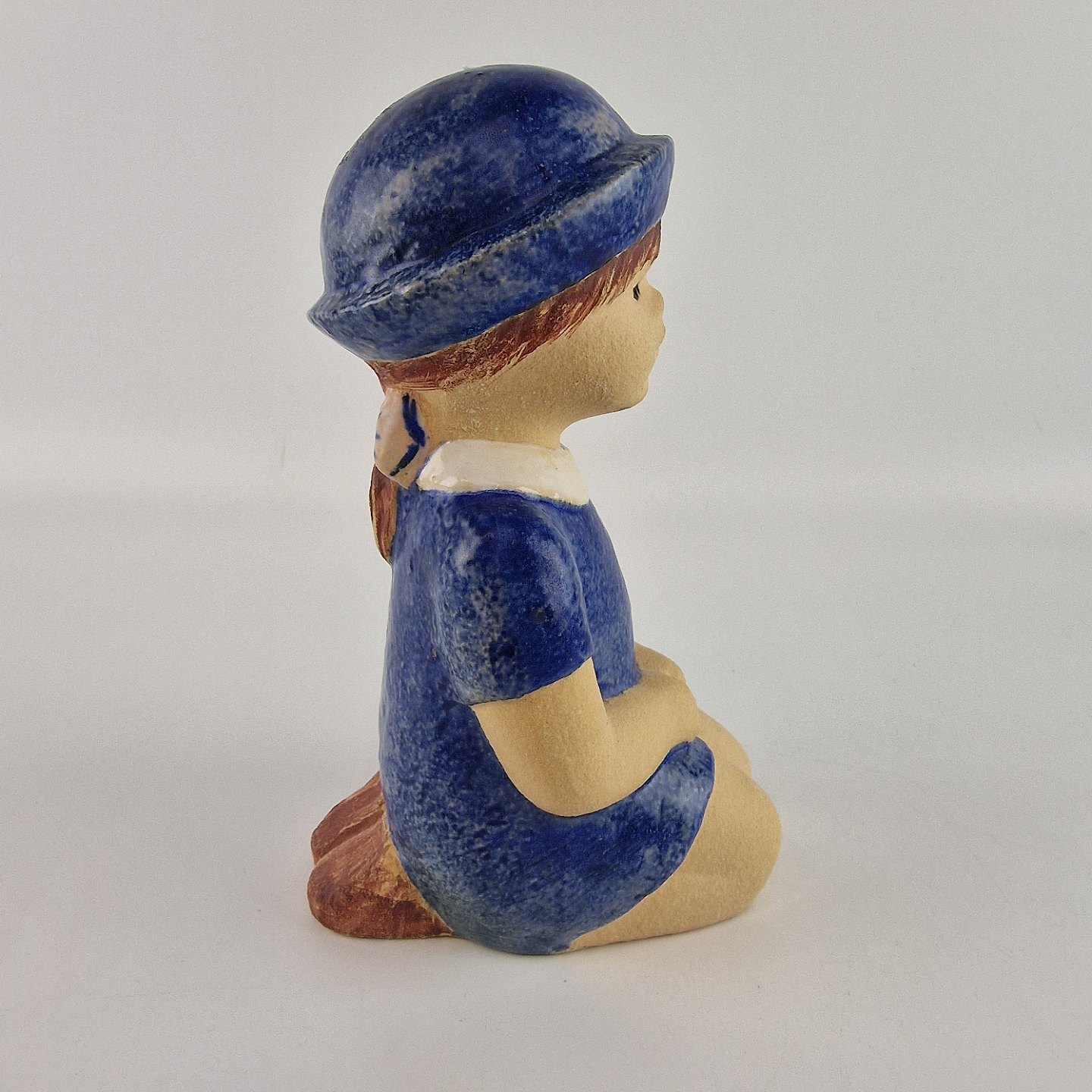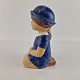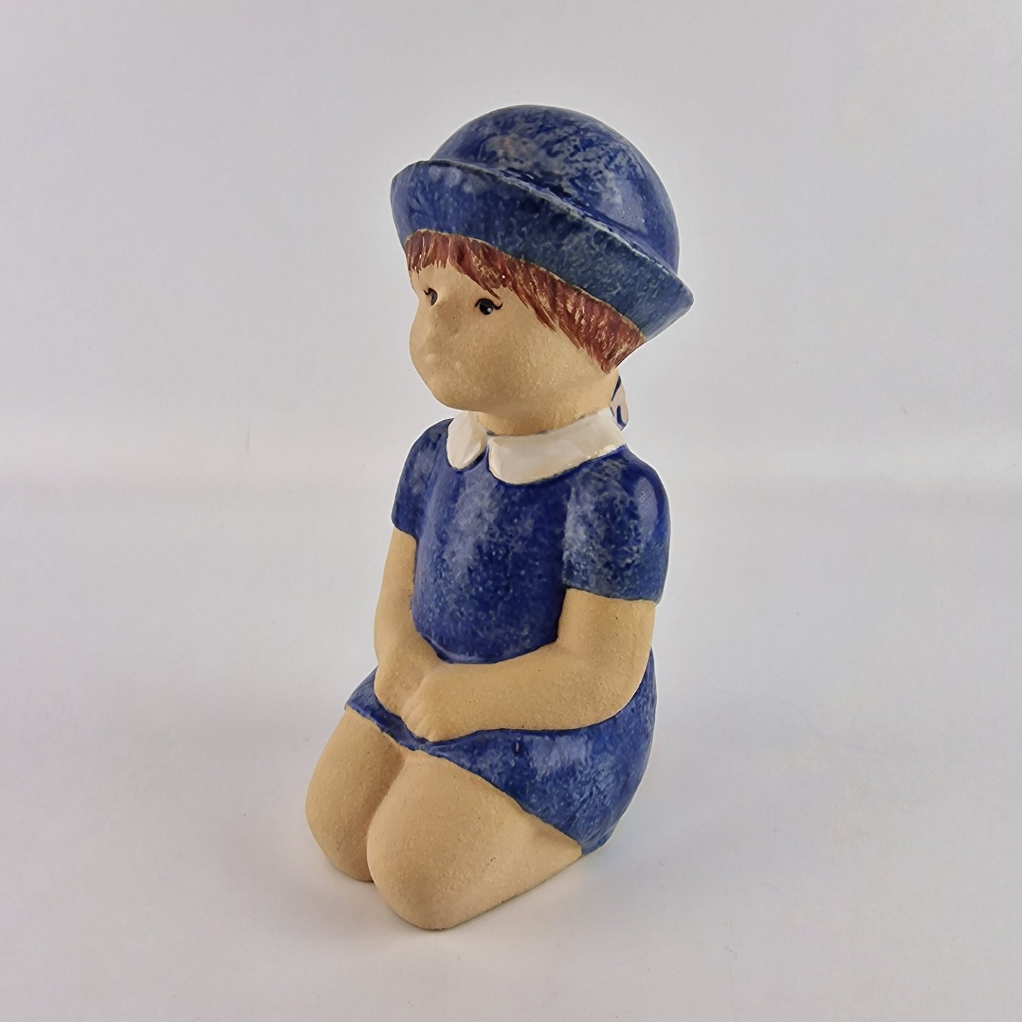 Keramikfigur af en hånddekoreret siddende pige med blå hat og kjole. Figuren hedder Dressed for Summer (Sommarkladd) og er fra serien Sculptures, designet i 1977