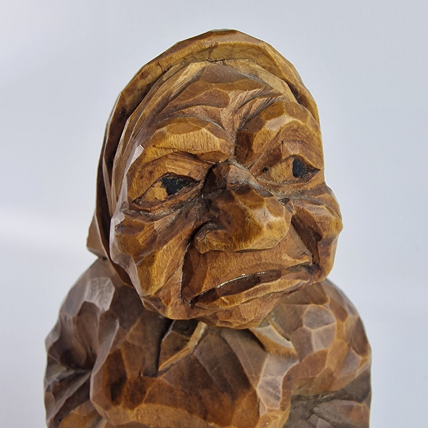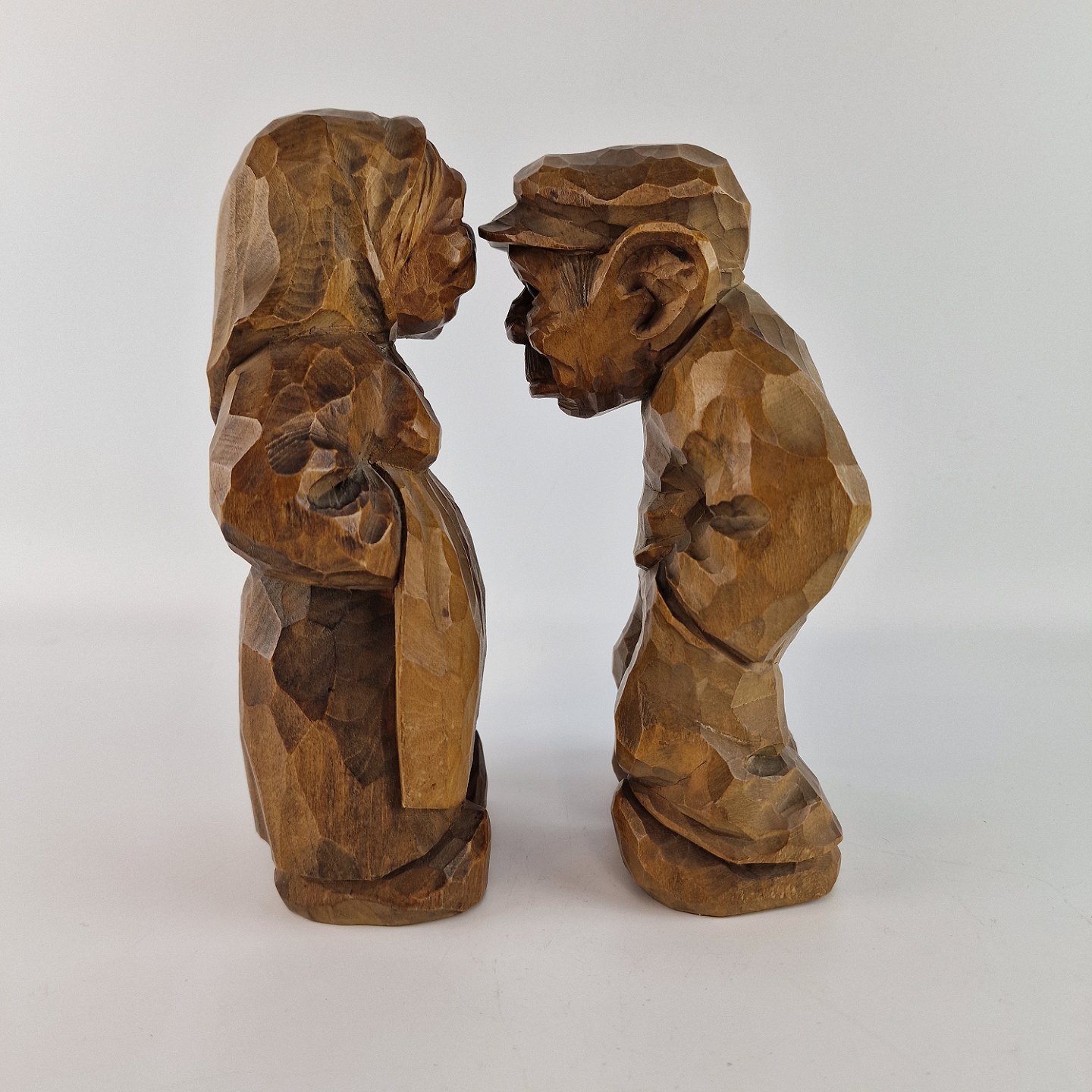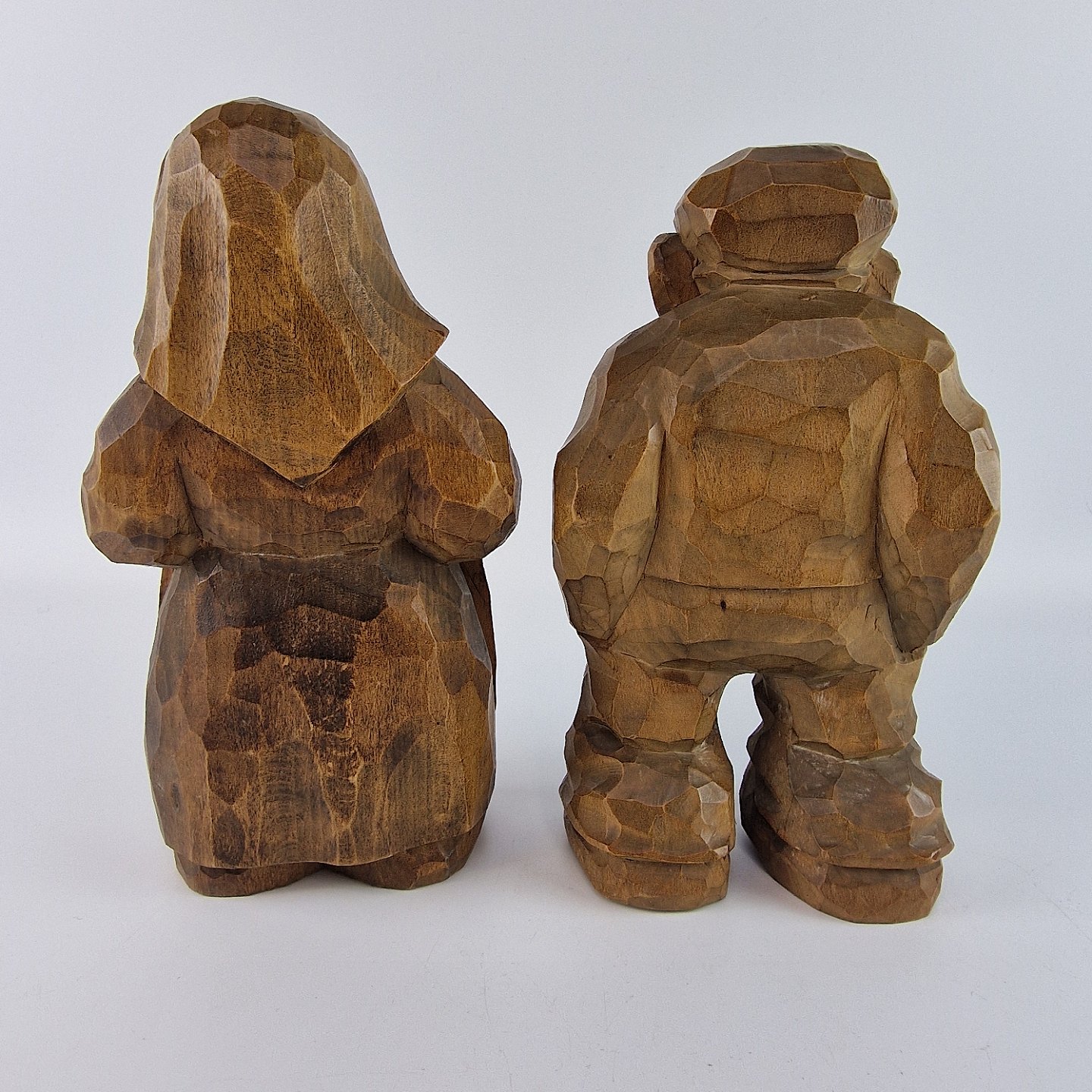 Figurer af håndsnittet træ, der forestiller en kvinde og en mand. Nr. n-30. D406-357. Solgt igennem Wiggers