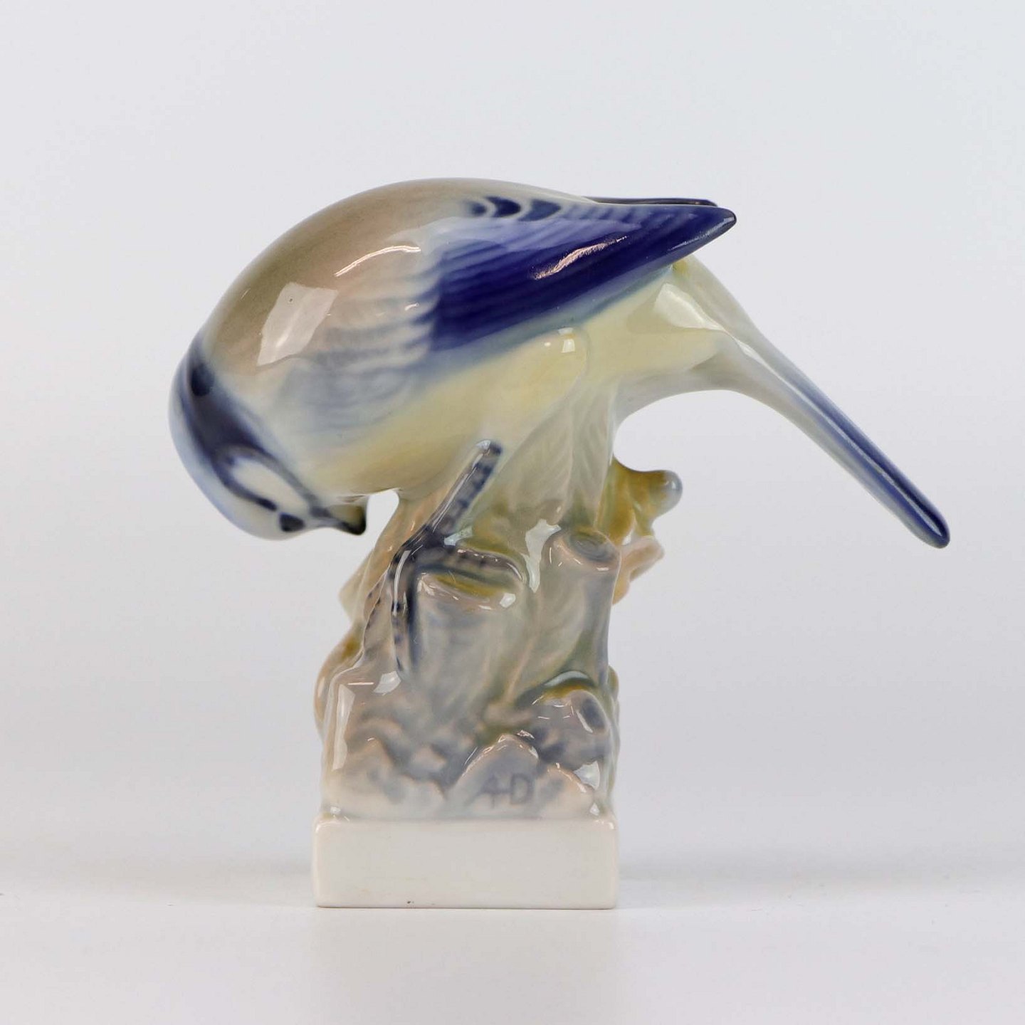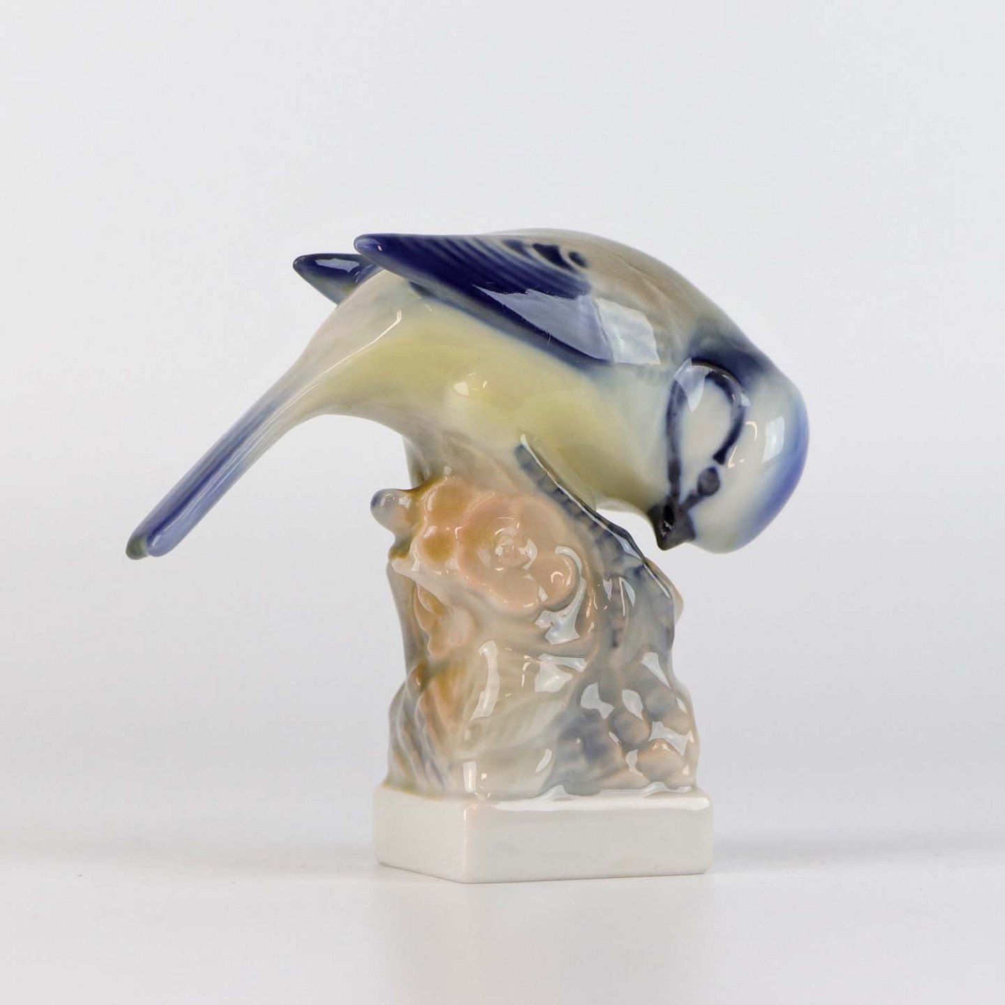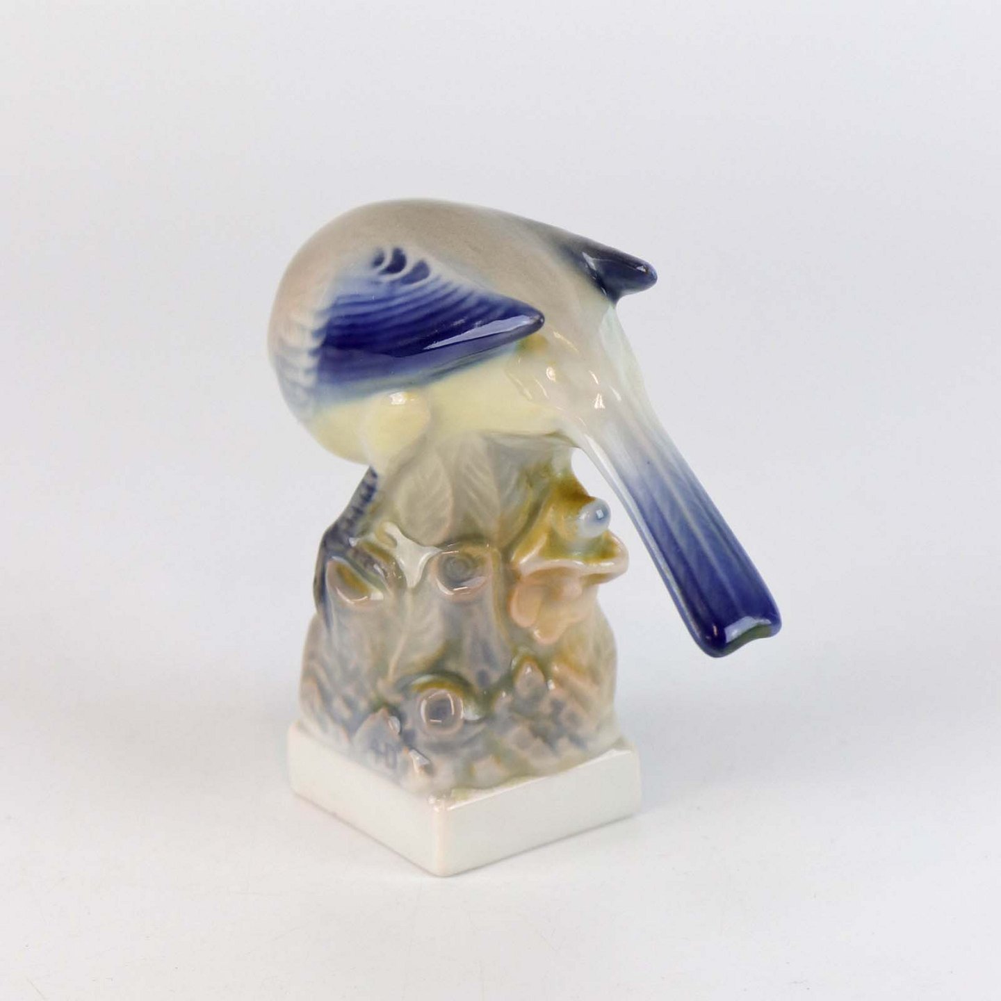 Mindre figur med motiv af blåmejse på træstub nr 78
