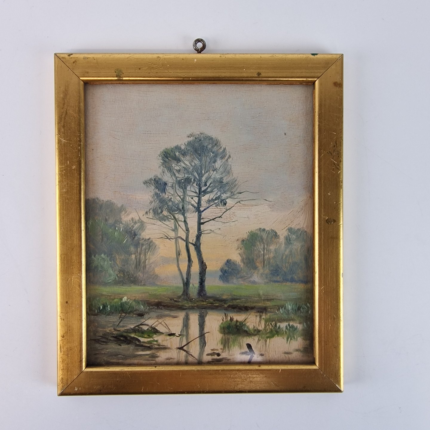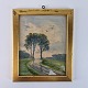 Samling af seks forskellige indrammede oliemalerier på plade i forgyldte trærammer med varierende landskabskompositioner. Sælges samlet.