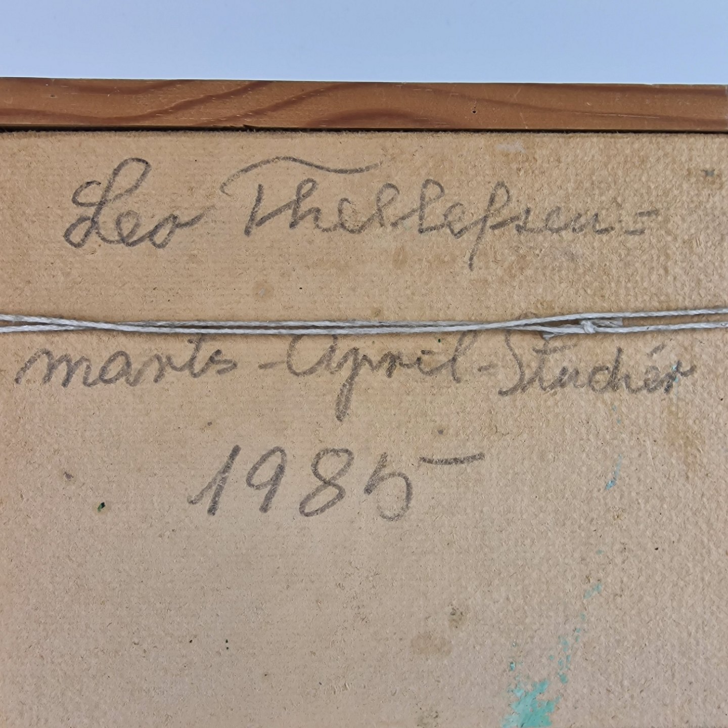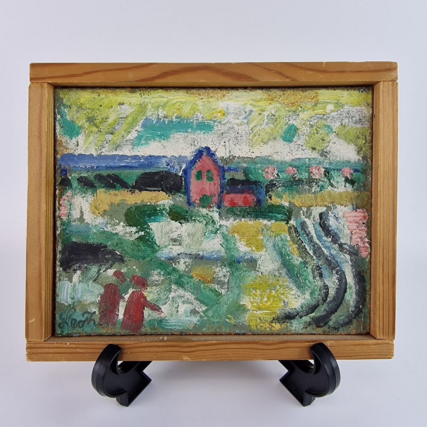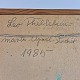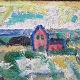 Maleri på lærred med motiv af landskab og kirke. Dateret 1985