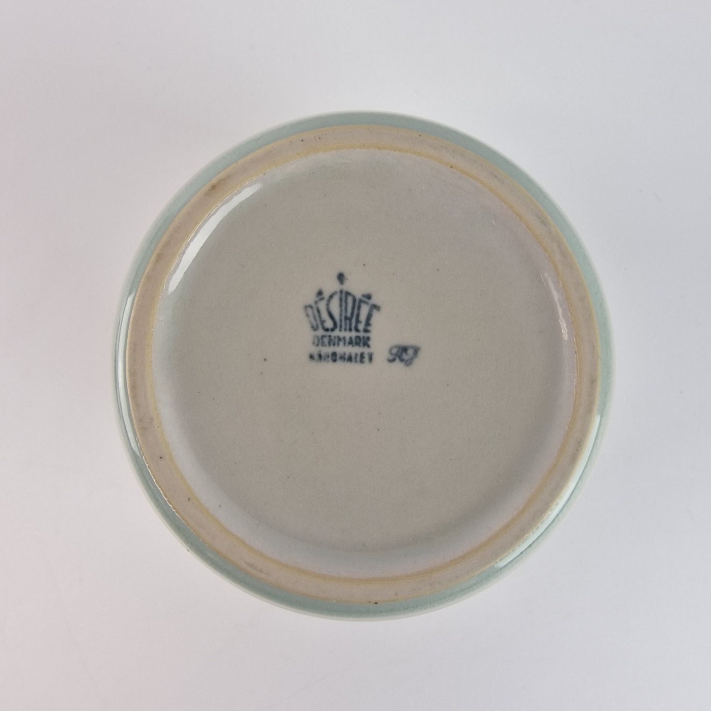 Diskos er af ovnfast stentøj. Stellet er gråt og håndmalet med brune og grønlige detaljer