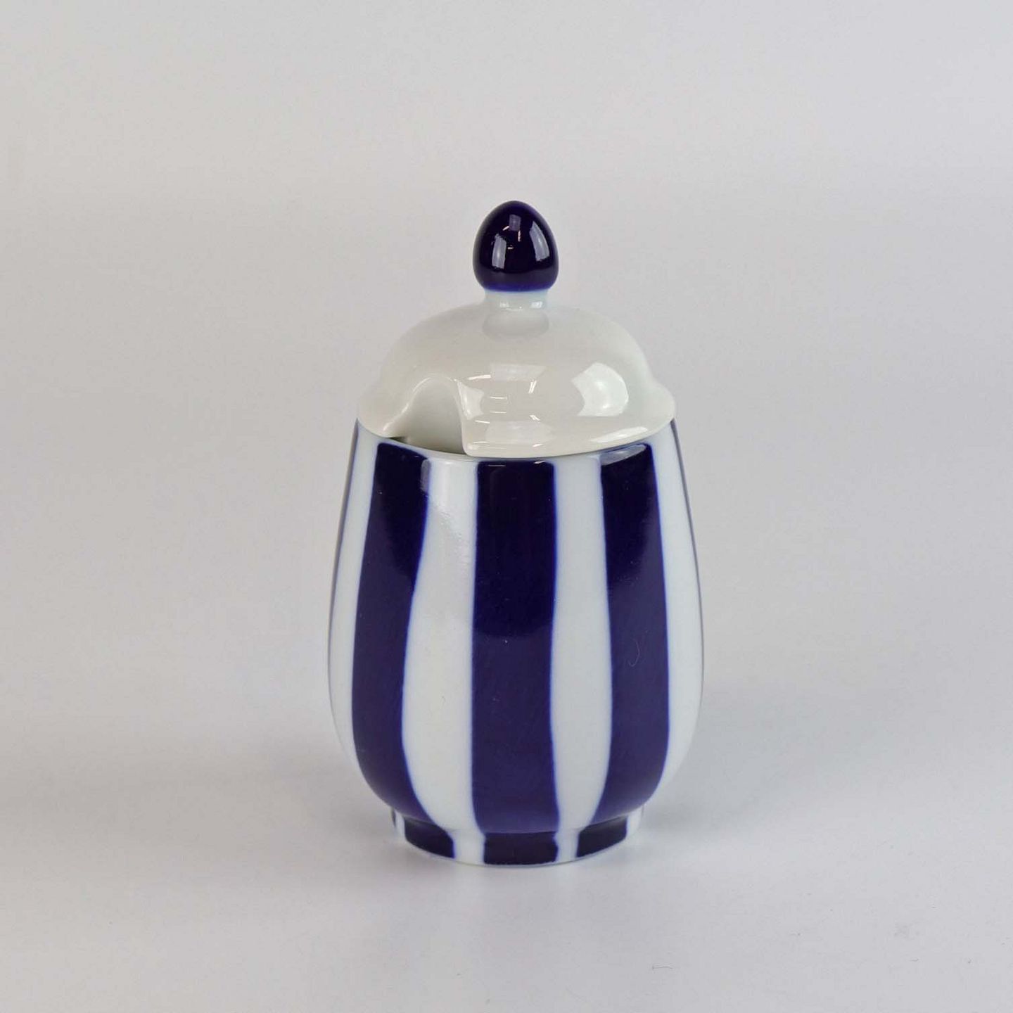 Lille sennepskrukke med låg i porcelæn fra stellet blå striber