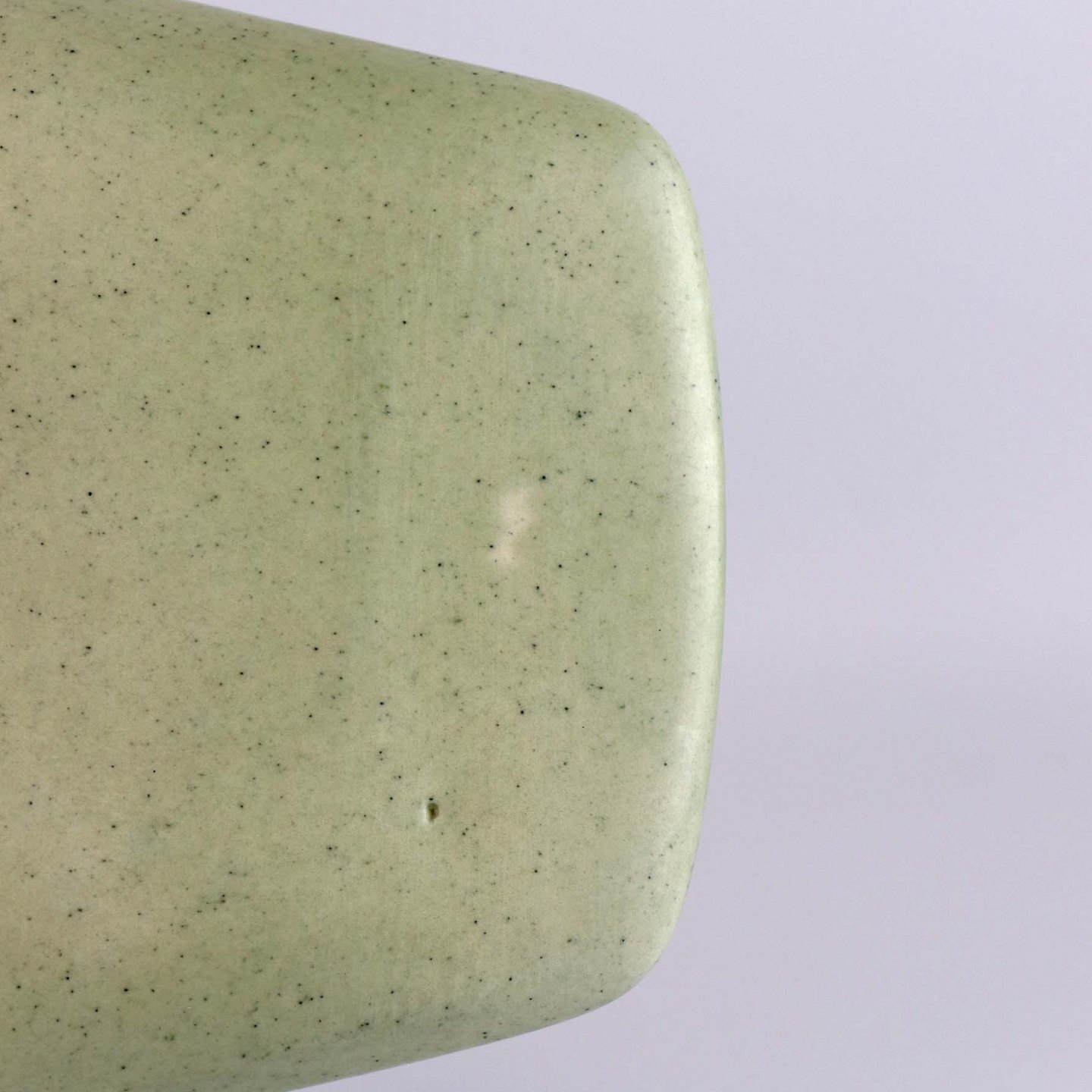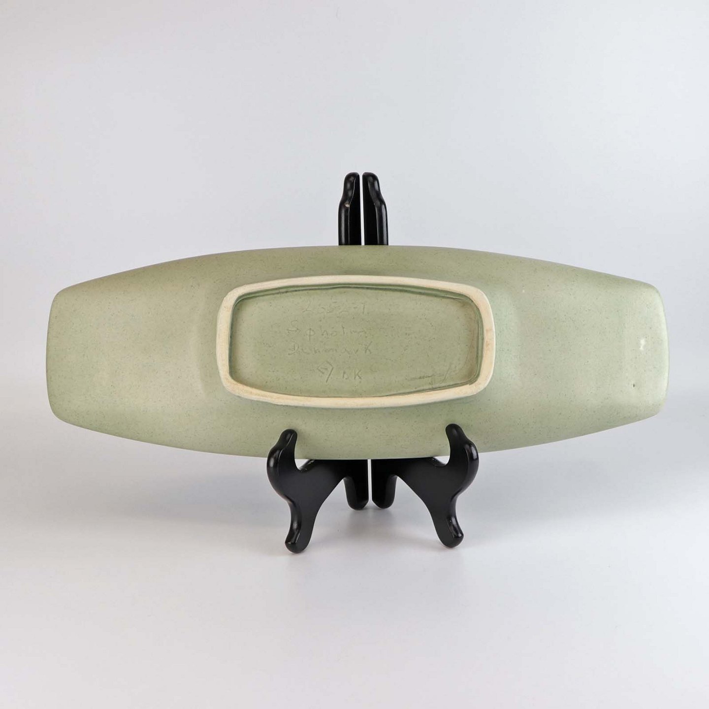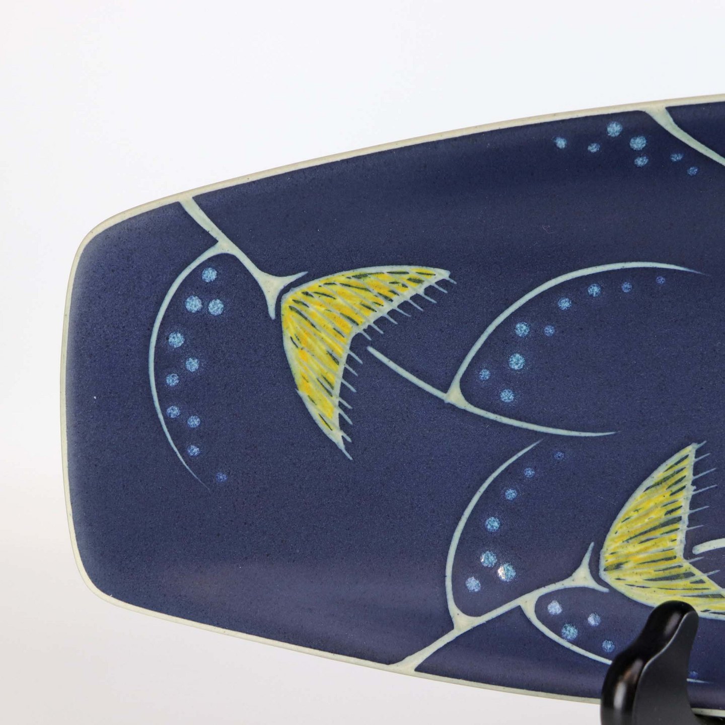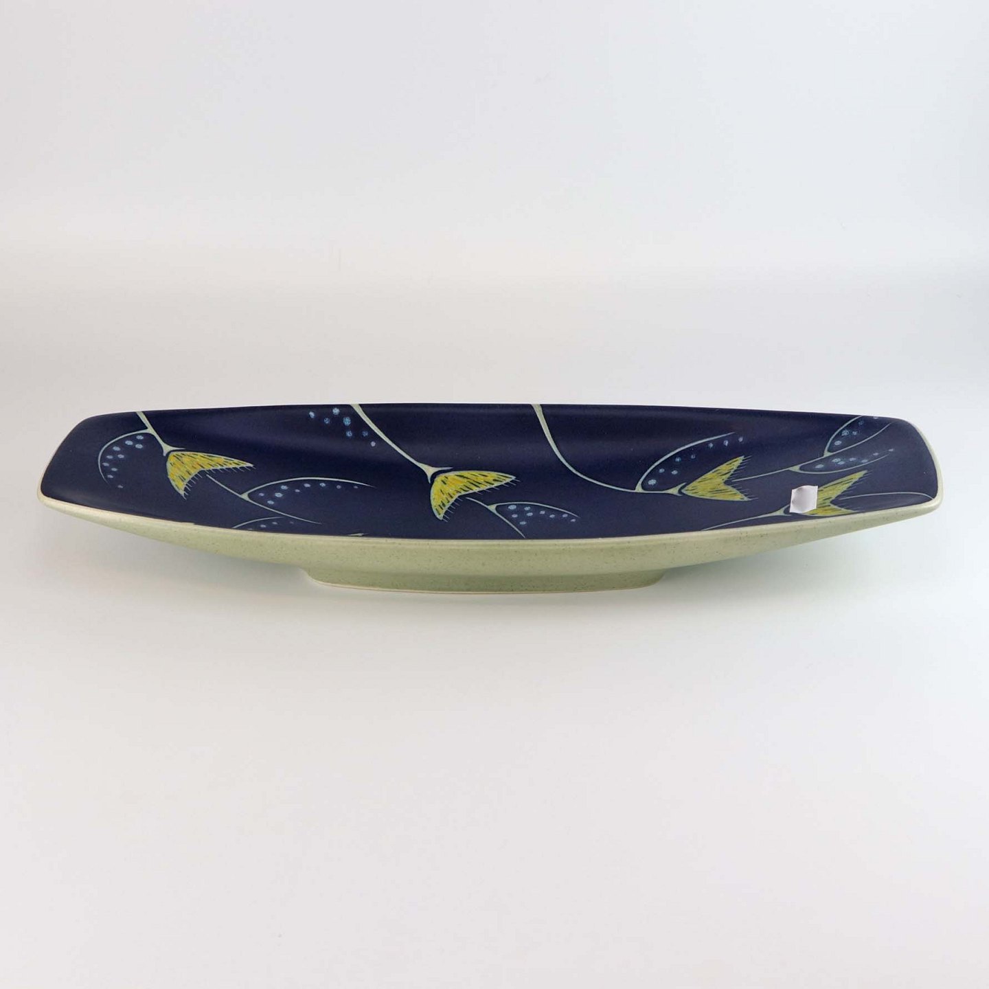 Smalt aflangt fad i keramik nr. 2052-1 med gult motiv på mørkeblå baggrund med lyseblå prikker