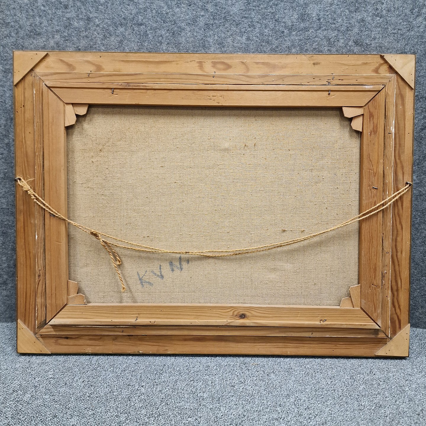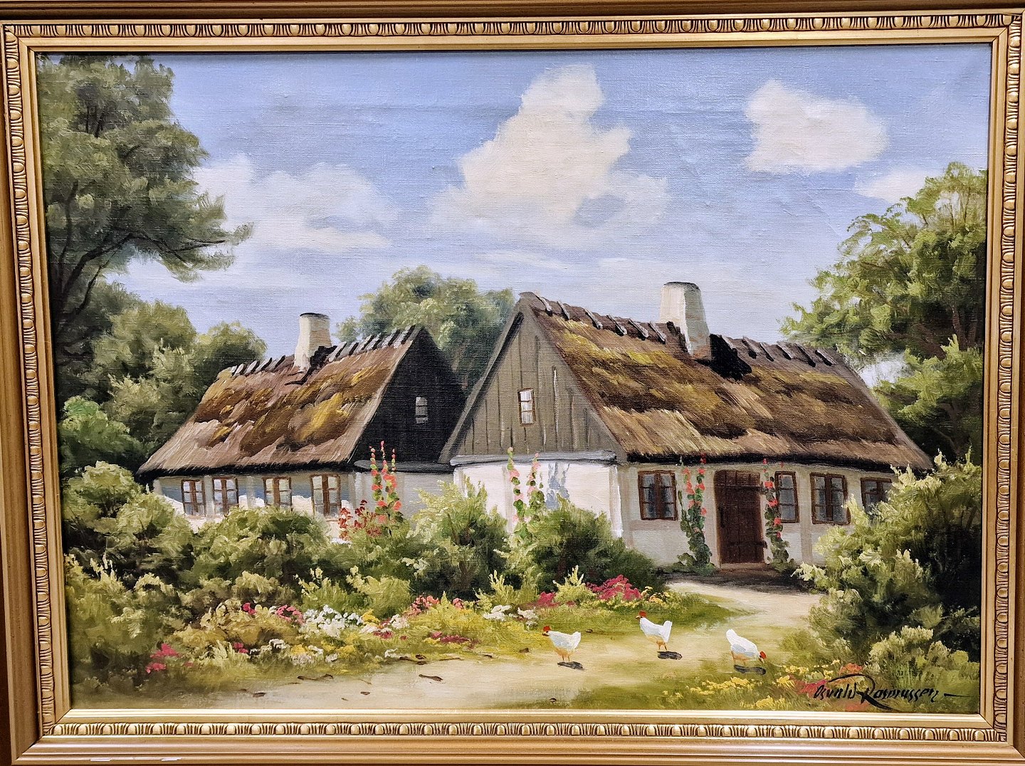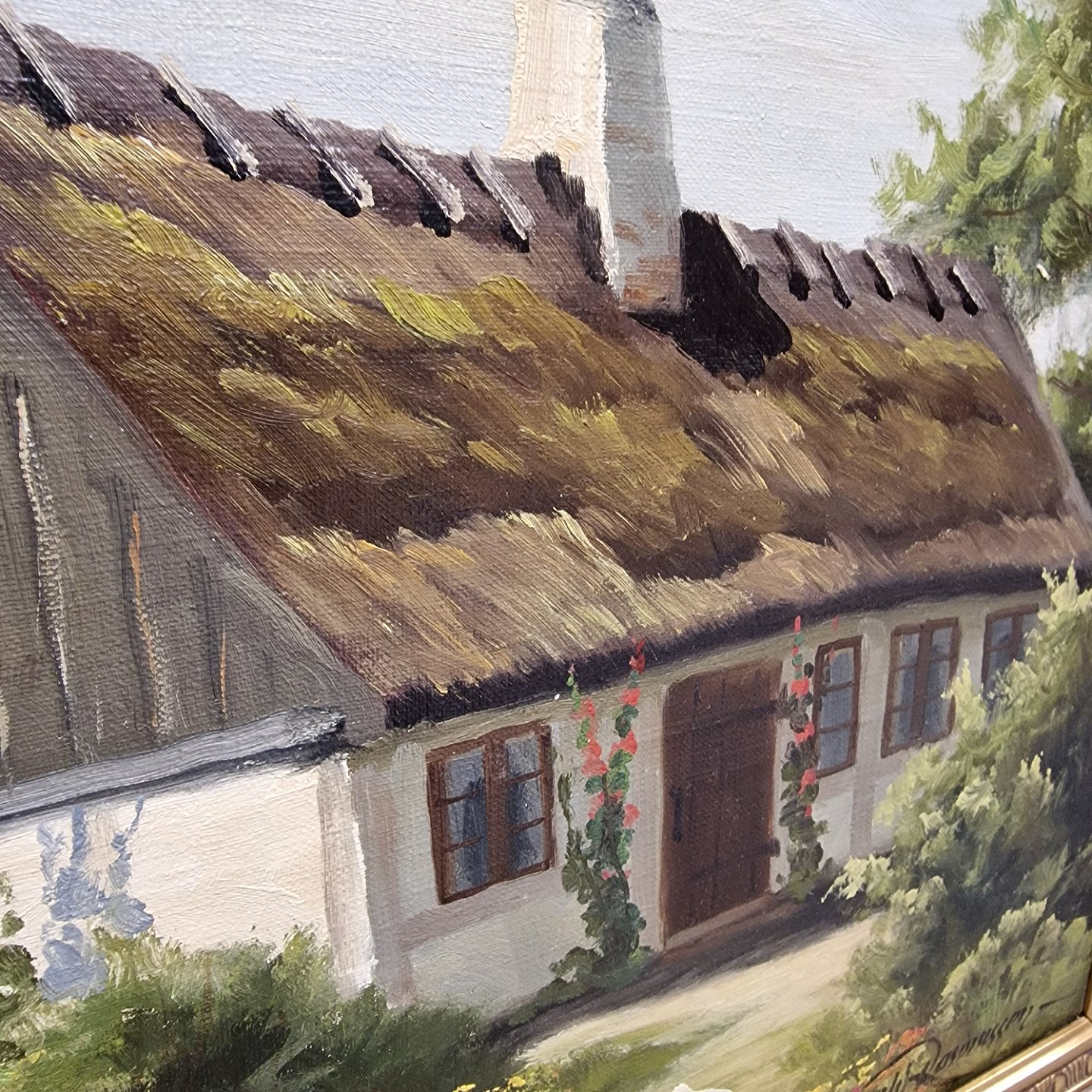 Oliemaleri på lærred. Landskabsmaleri af hvidt stråtækt hus