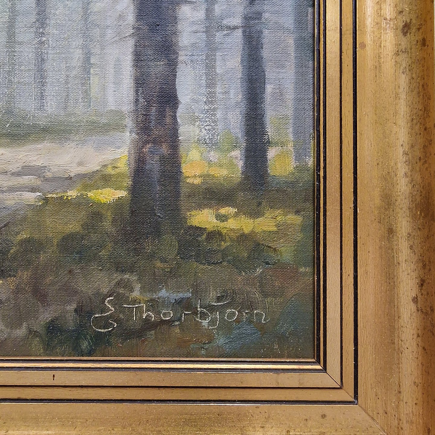 Natur maleri på lærred, med motiv af en skovvej med træer på begge sider. Sandsynligvis Rold skov