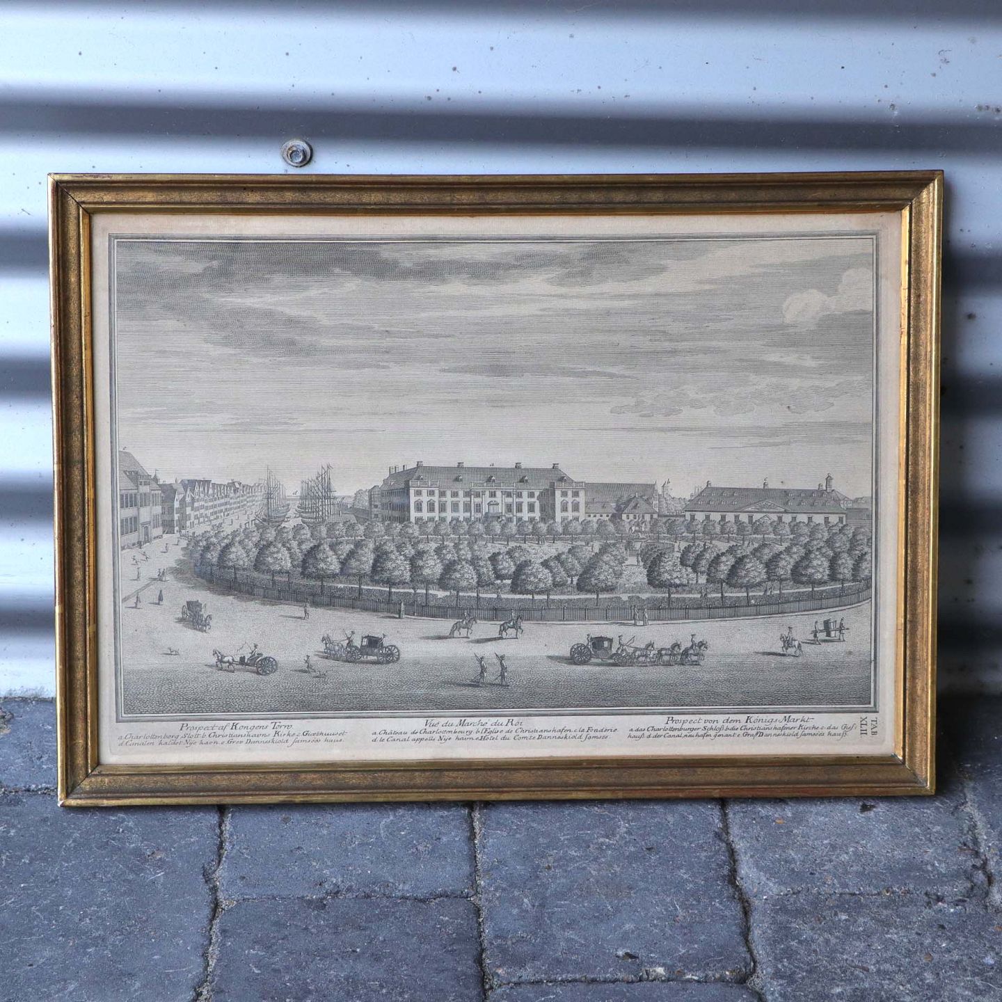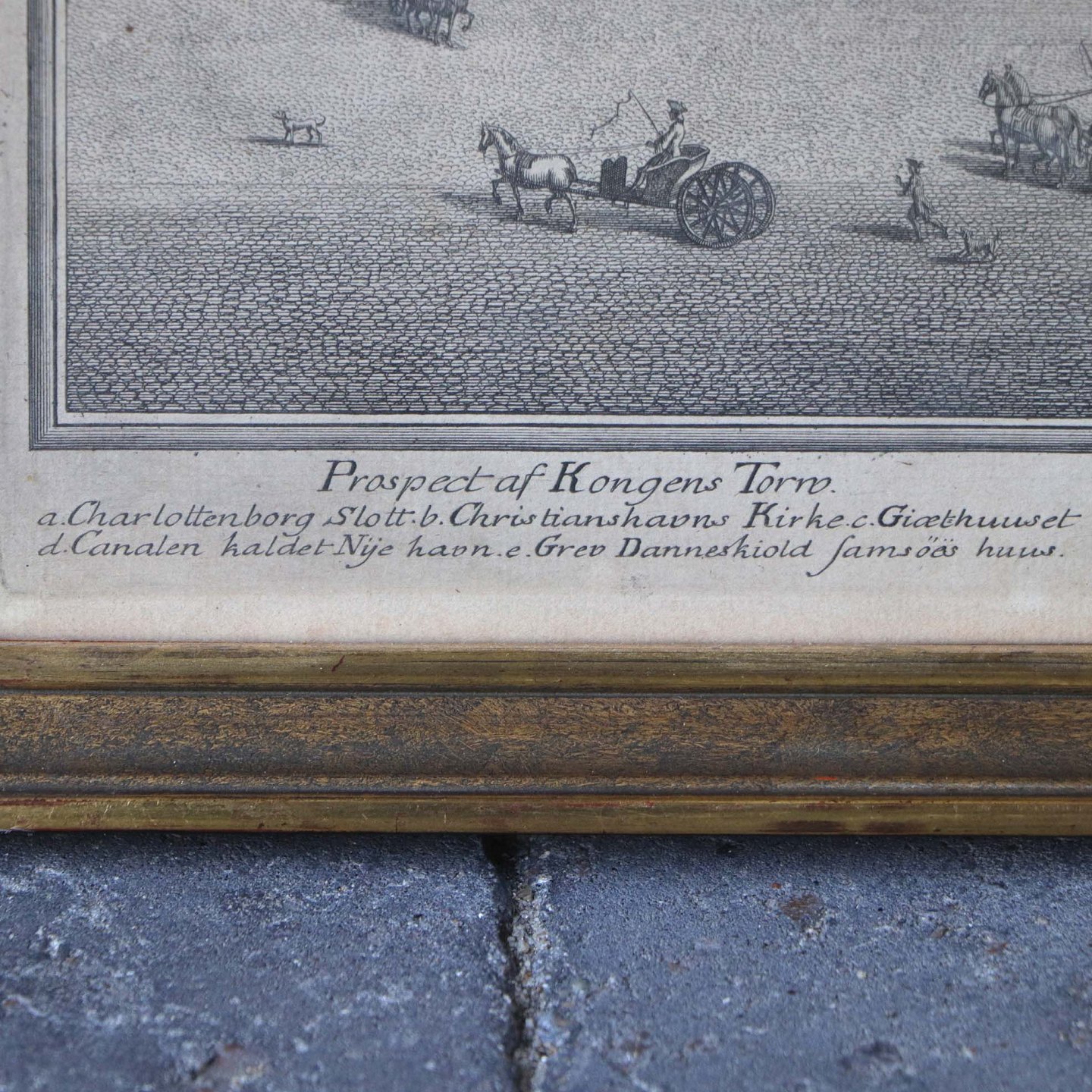Indrammet tryk monteret i gylden ramme. Gammelt bogtryk med titlen Prospect af Kongens Nytorv med motiv af område i København med udsigt til Nyhavn, Christianshavn Kirke, Charlottenborg slot, Grev Dannerskjold huset