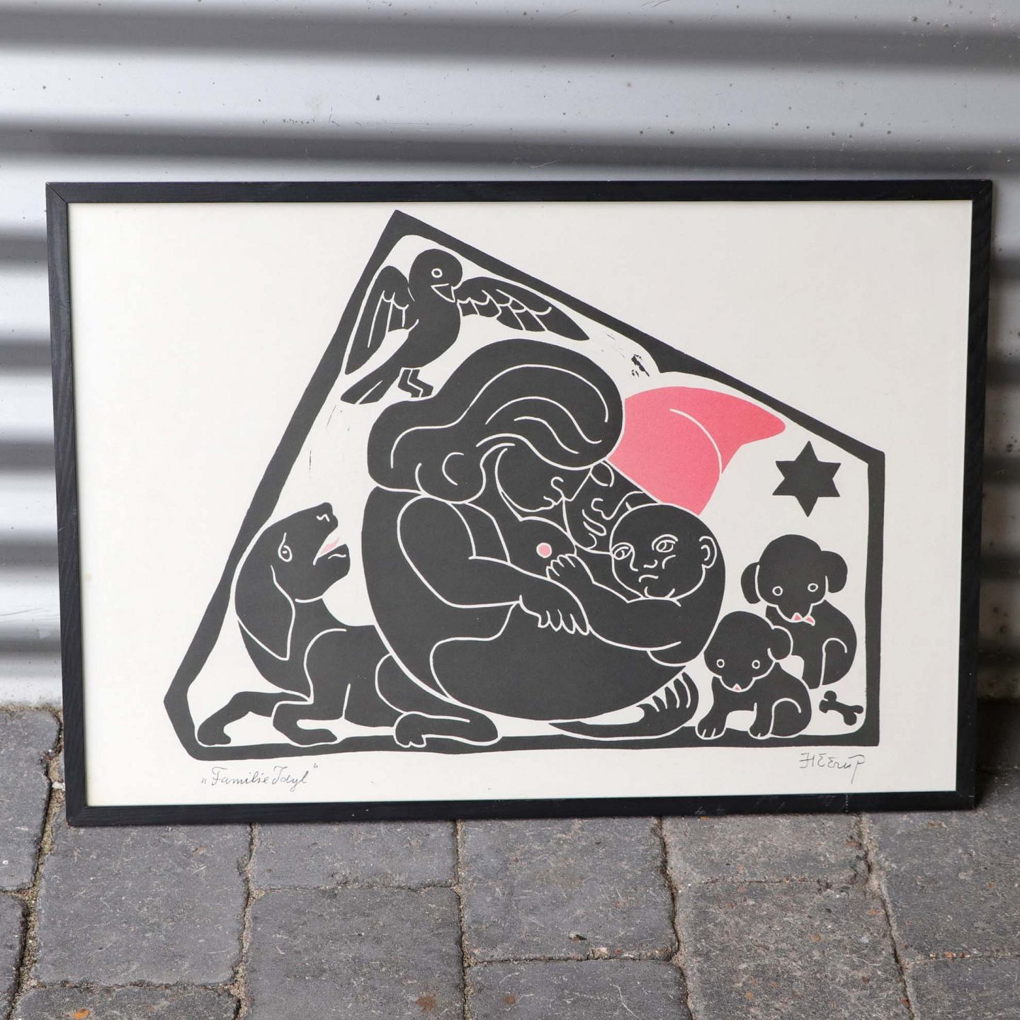Indrammet litografi i sort ramme. Grafisk tryk i sort, hvidt og rødt under titlen Familieidyl. Motivet viser mor med barn og hund med hvalpe under en svævende fugl og et rødt hjerte