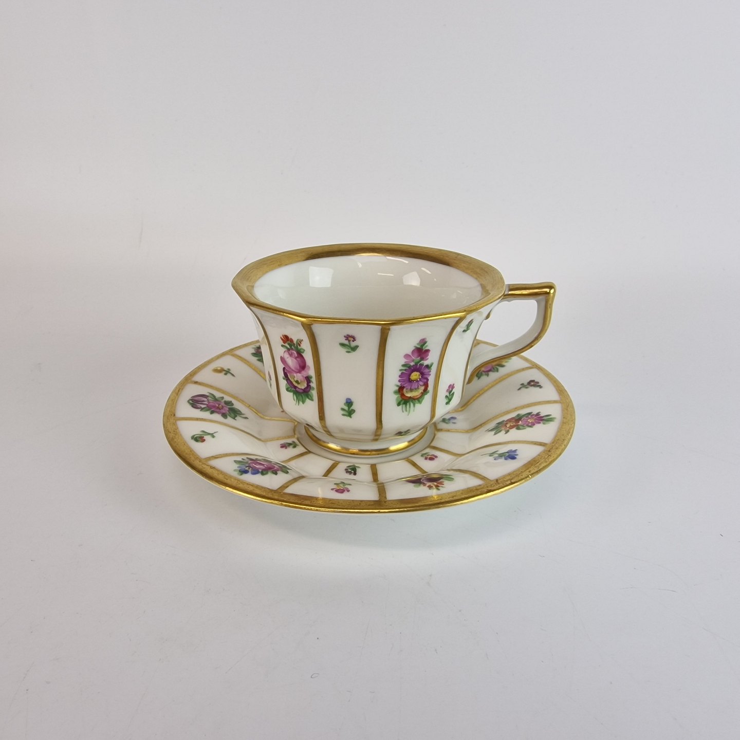 Henriette er af porcelæn og har motiver af små blomsterbuketter og guldstreger på det kantede stel.