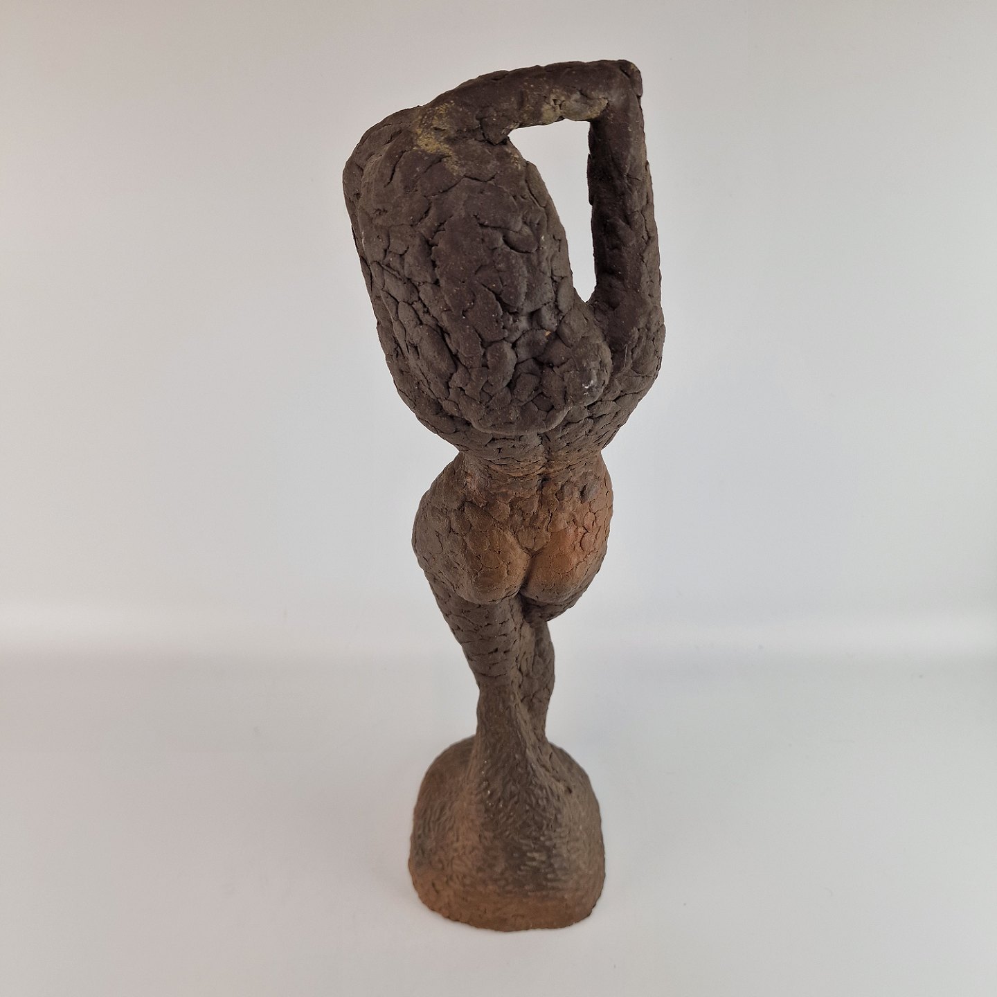 Statuette af nøgen kvinde med armene over hovedet.