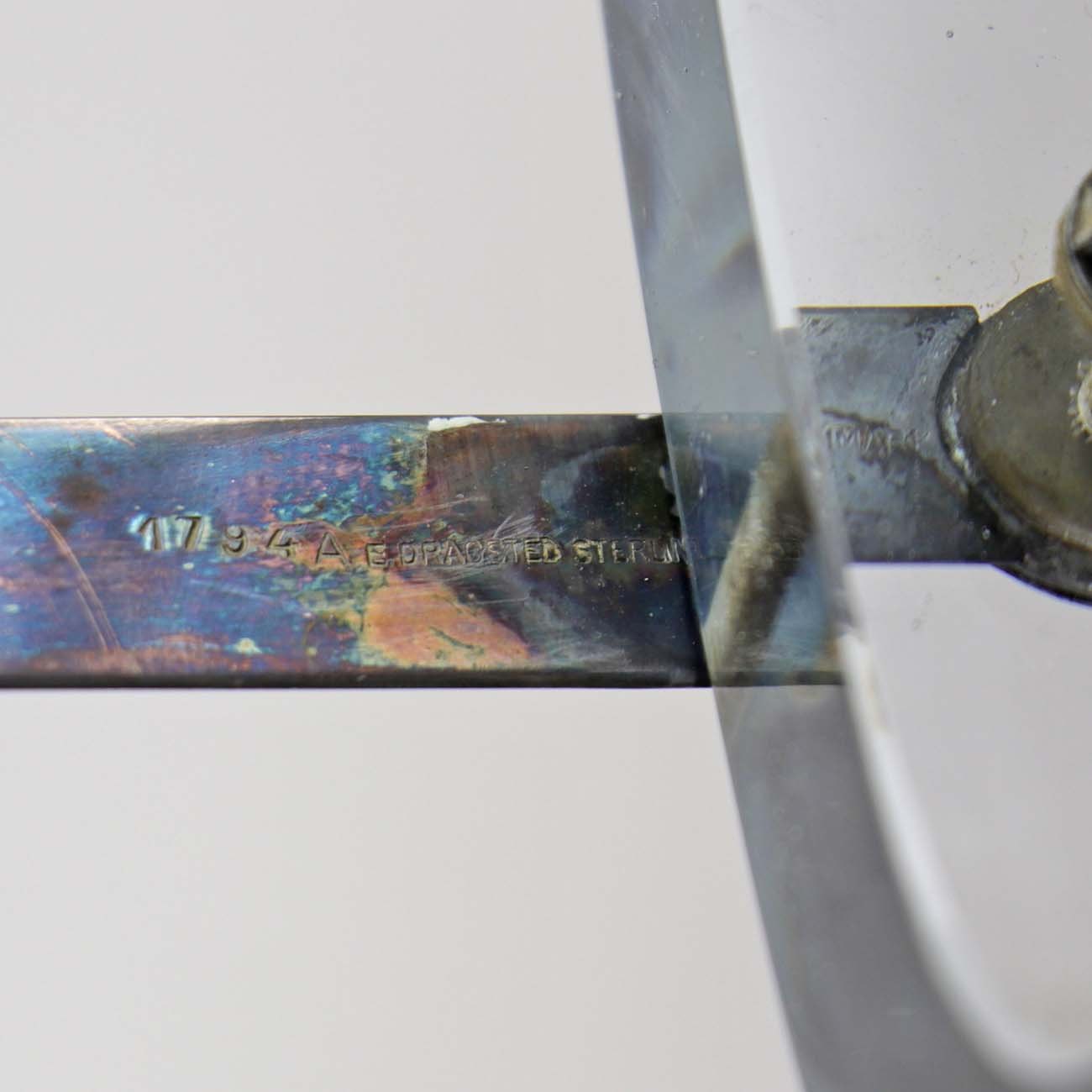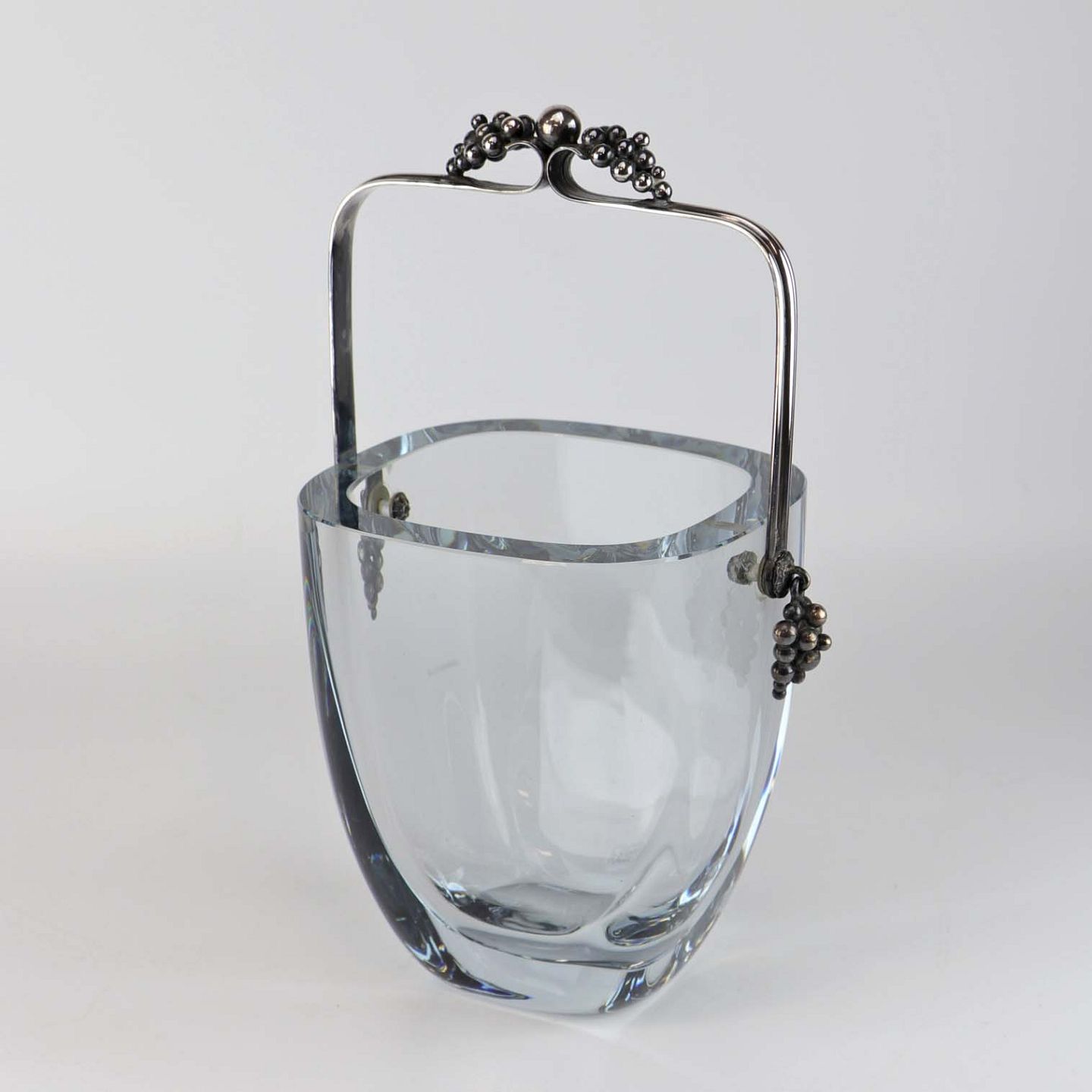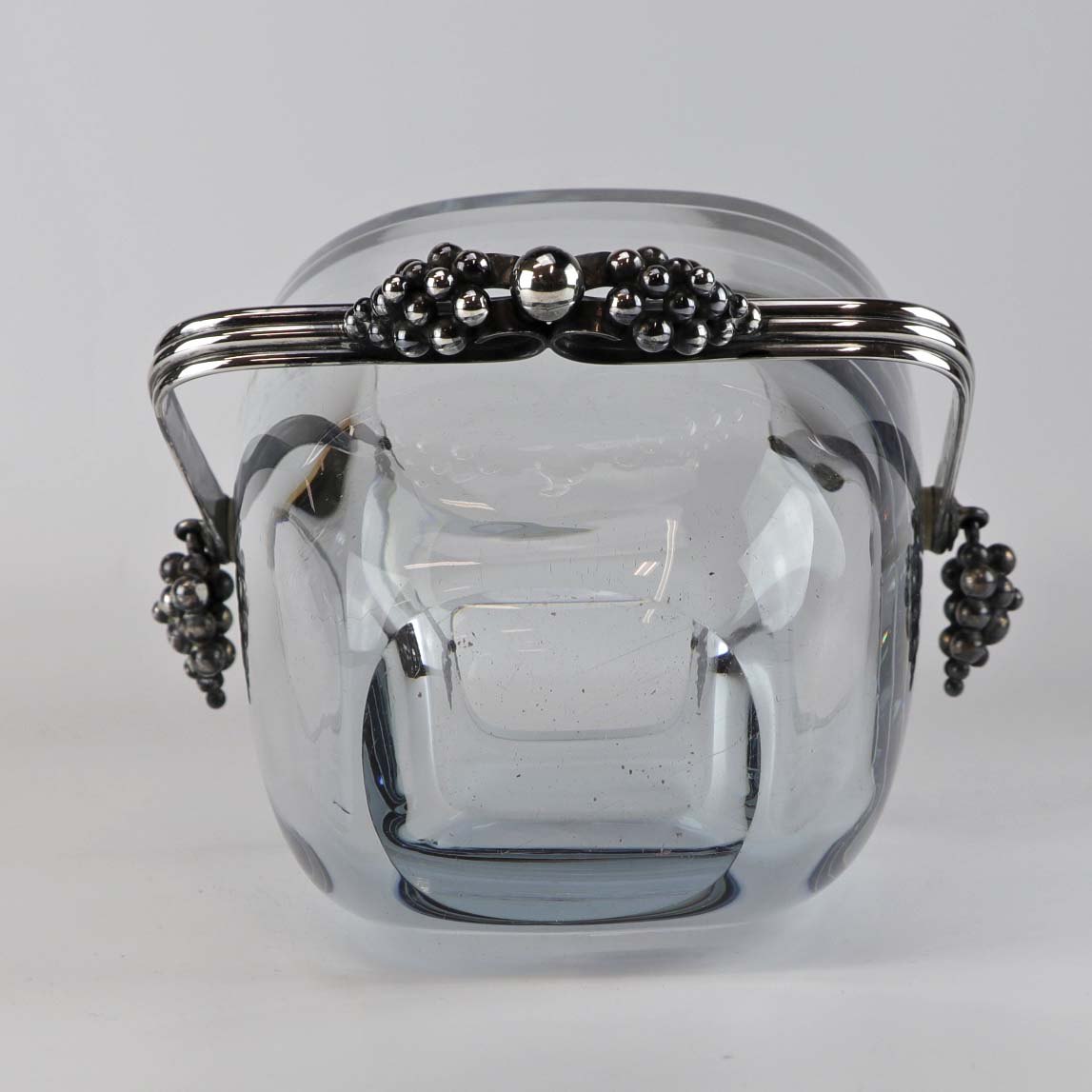 Isspand i klart lyseblåt glas med hank i sølv. Hanken er dekoreret med vindrueklaser