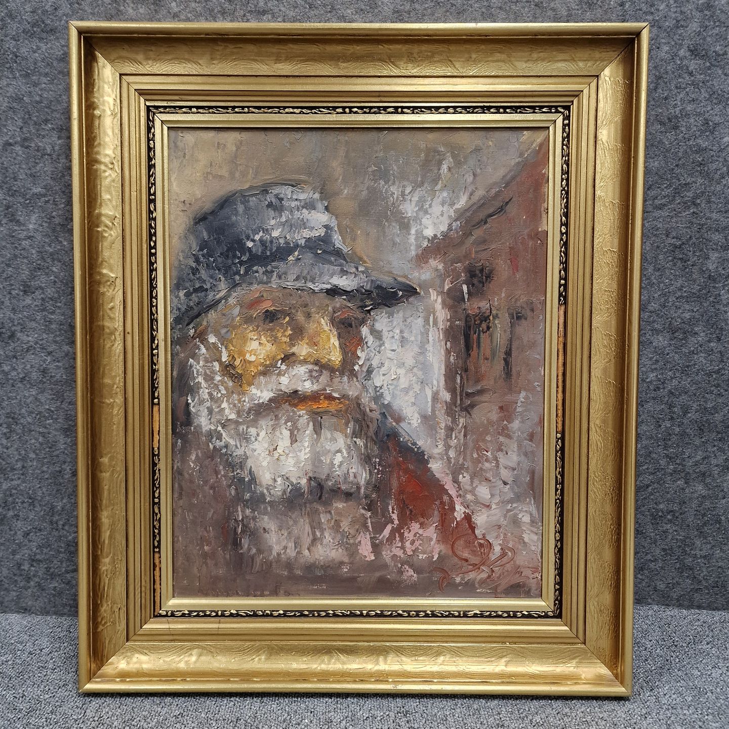 Oliemaleri på lærred. Impressionistisk portræt af mand med fuldskæg og hat.
