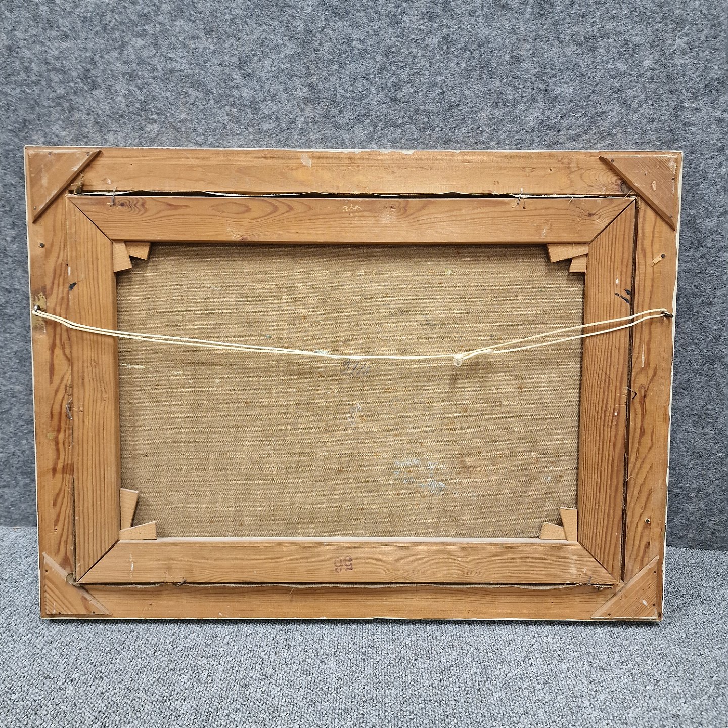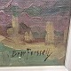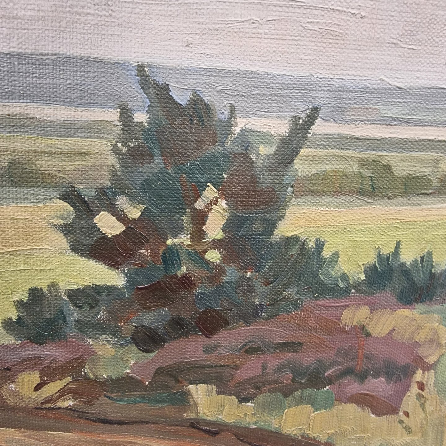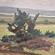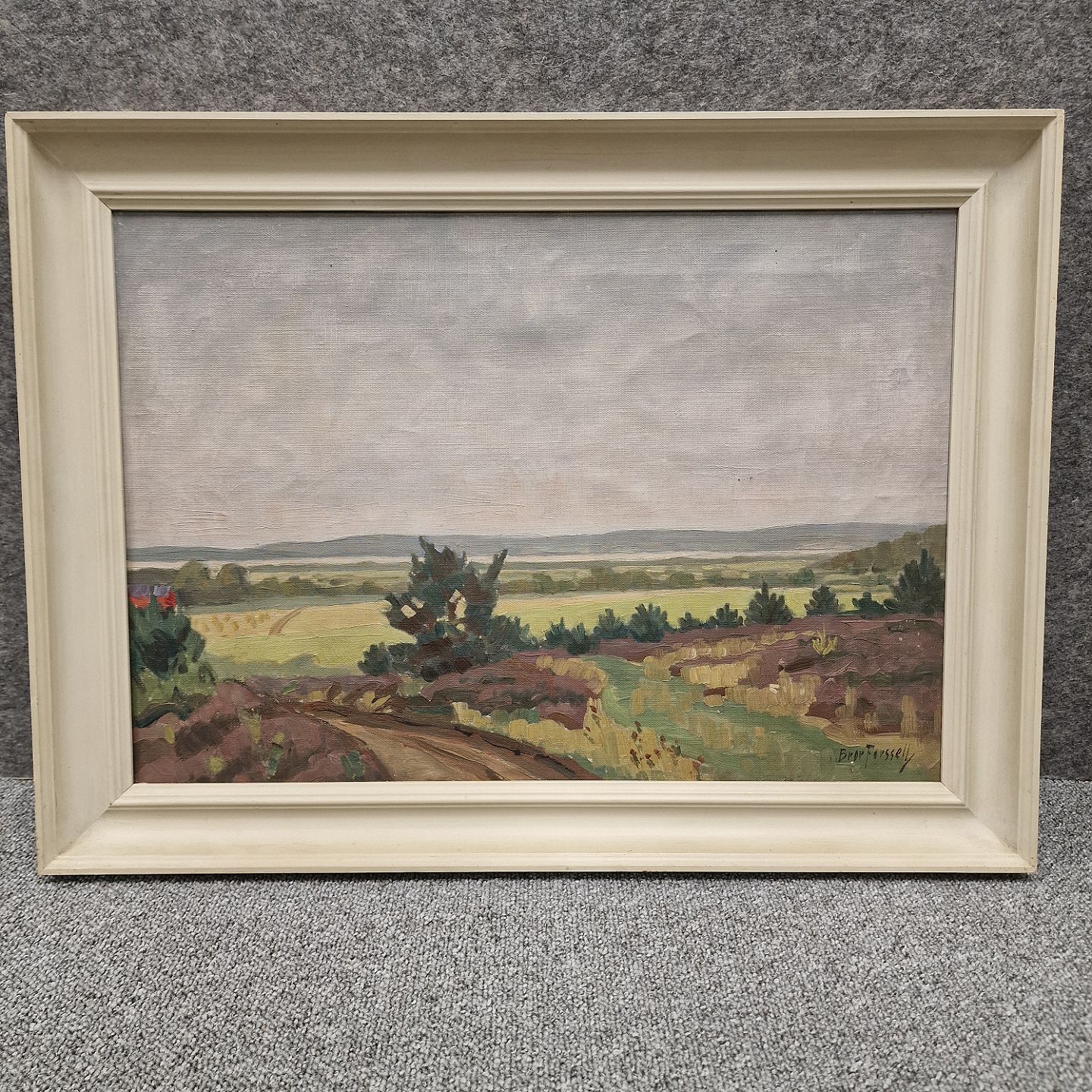 Oliemaling på lærred. Landskabsmaleri ved vej med udsigt til vandet