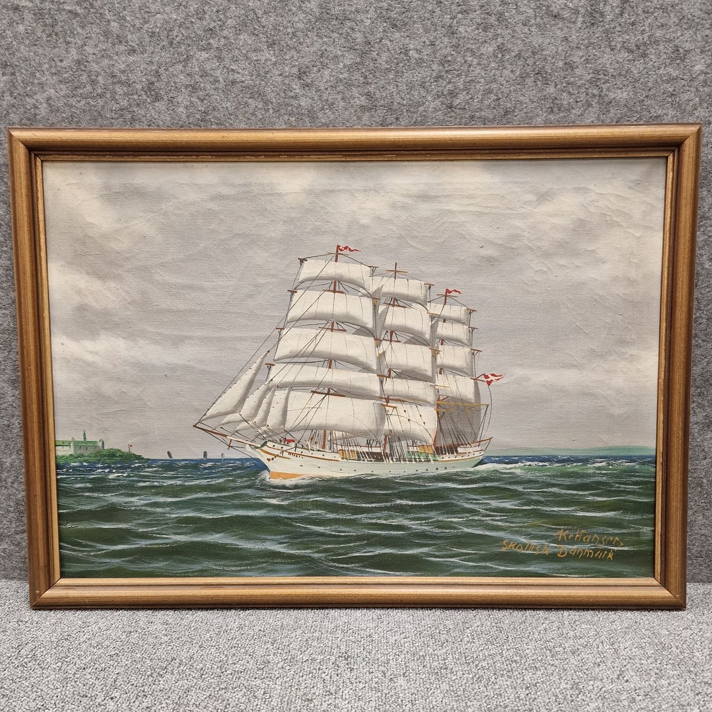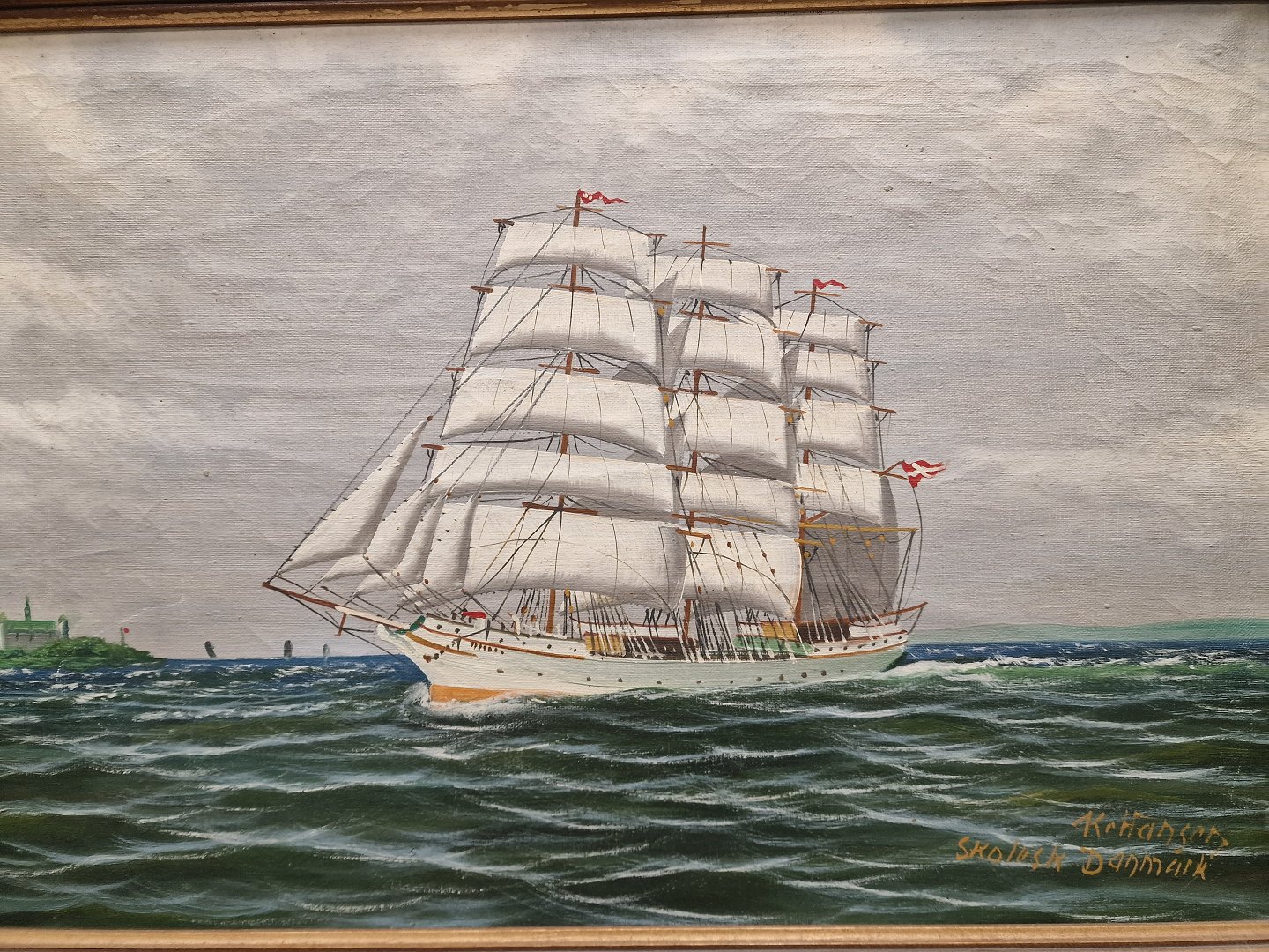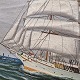 Oliemaling på lærred. Motivet er Skoleskibet Danmark med kurs mod rundingen ved Kronborg